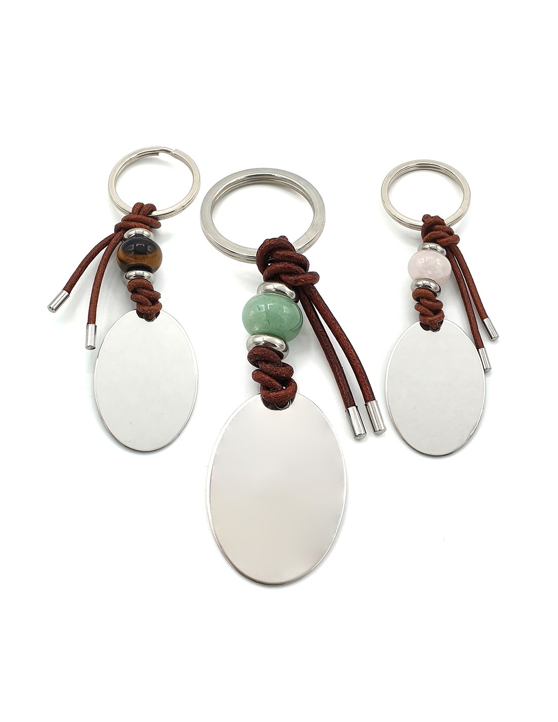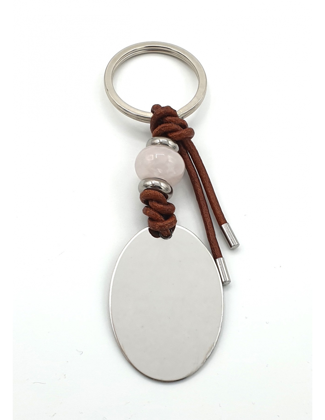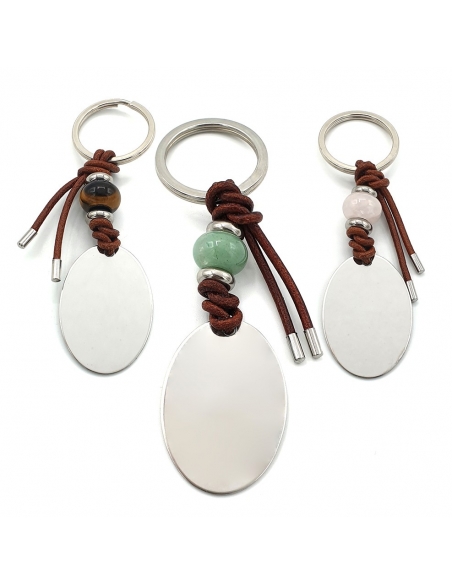Llavero MINERAL, ojo de tigre, aventurina, cuarzo rosa, cuero y cordón, acero inoxidable.