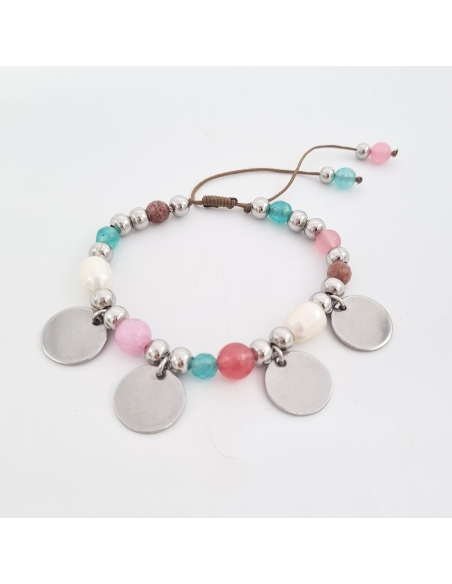 Pulsera modelo AURORA, con ágatas y perlas barrocas, material acero inoxidable, ajustable.