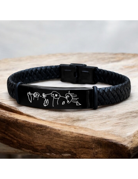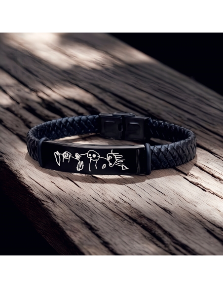 Pulsera modelo BLACK DANIALS de cuero trenzado y de acero inoxidable con dibujo infantil. Ajustable.