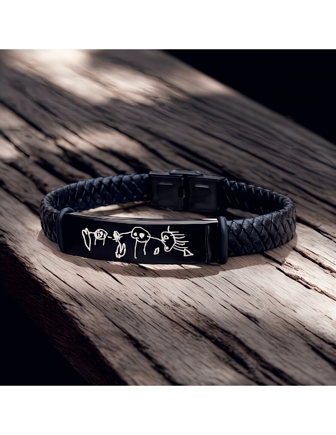 Esta elegante pulsera de cuero trenzado y acero inoxidable es el accesorio perfecto para un regalo único y especial. Su placa metálica permite personalización con la frase o dibujo que desees, convirtiéndola en un detalle exclusivo y significativo.