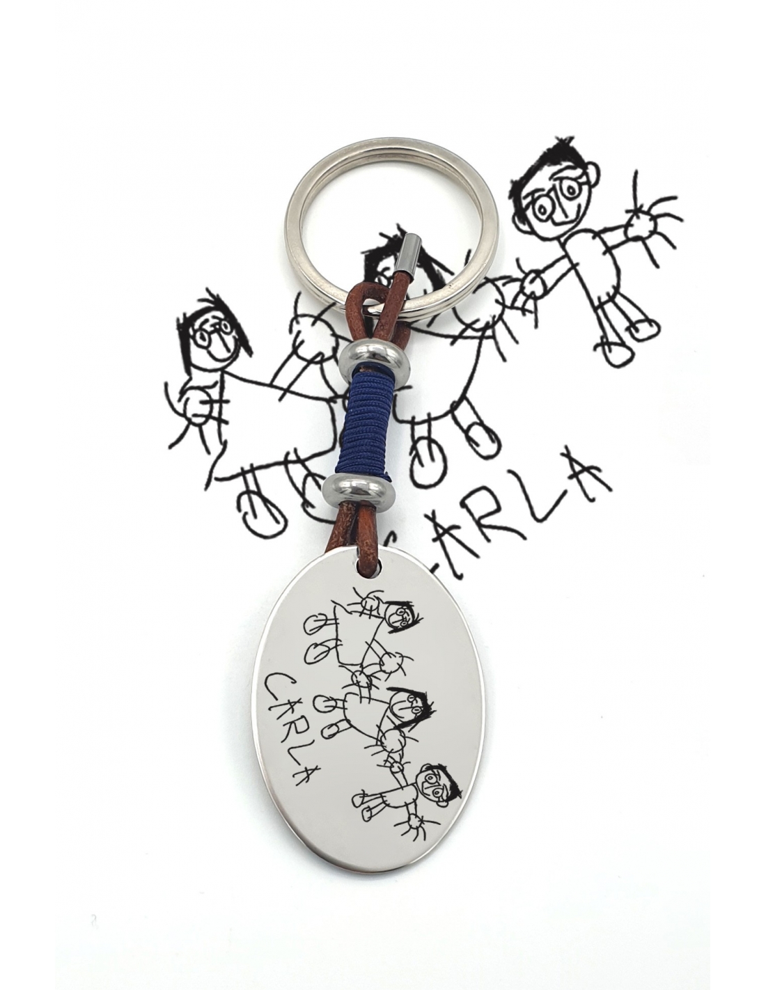 Llavero modelo KUKO, dibujo infantil, con toque de color, cuero y cordón, acero inoxidable.