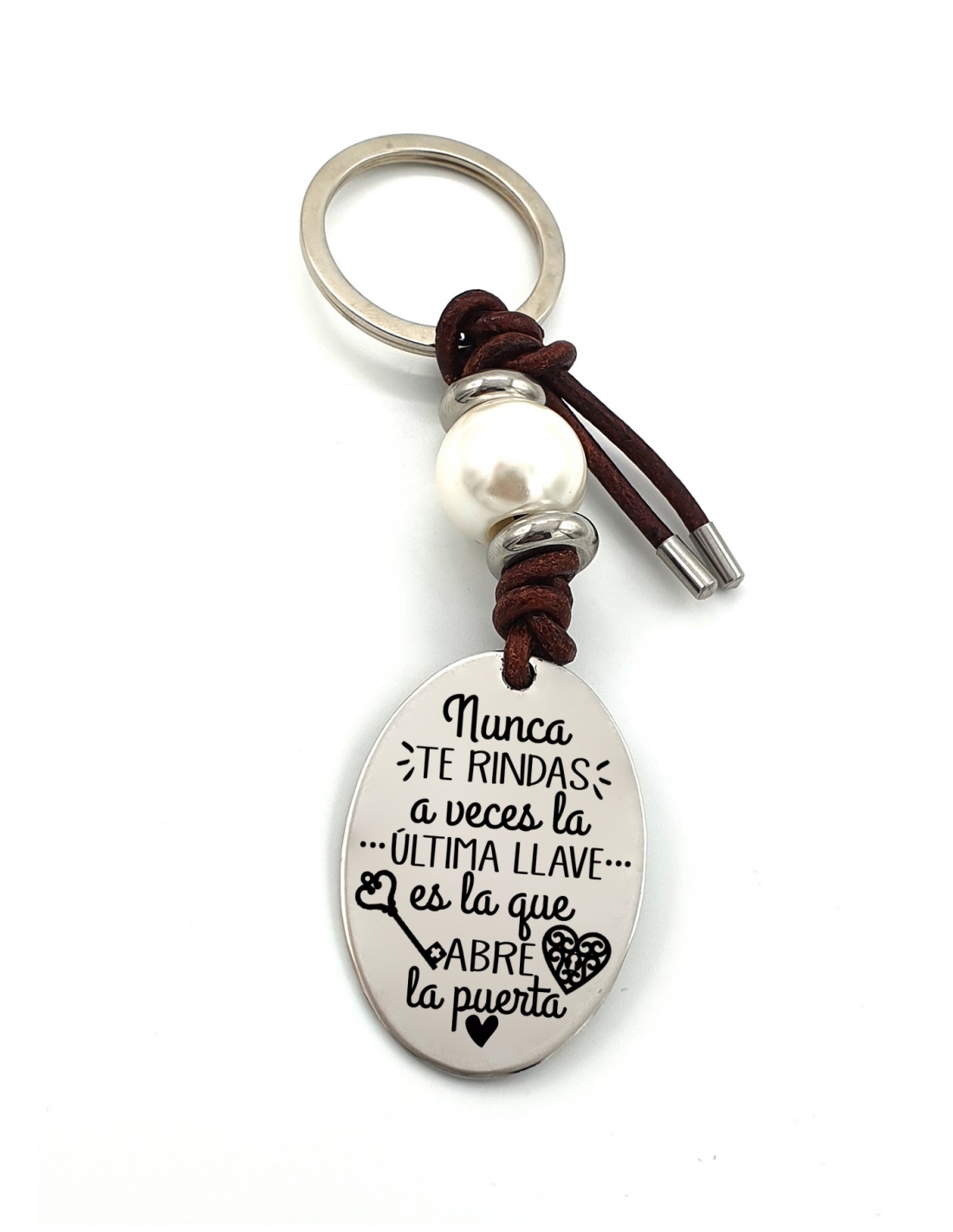 Llavero NÁCAR (Nunca te rindas, a veces la última llave abre la puerta) perla de resina y cuero nacional, acero inoxidable.