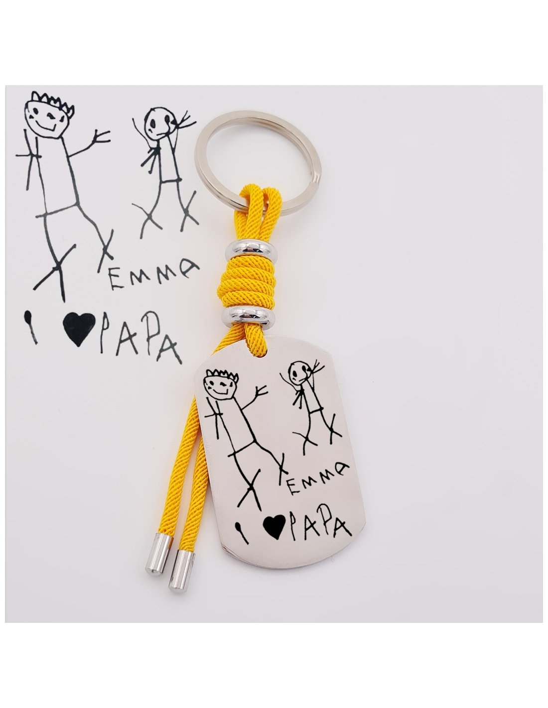 Llavero VENTURA, con dibujo infantil, con toque de color y cordón de milano, acero inoxidable.