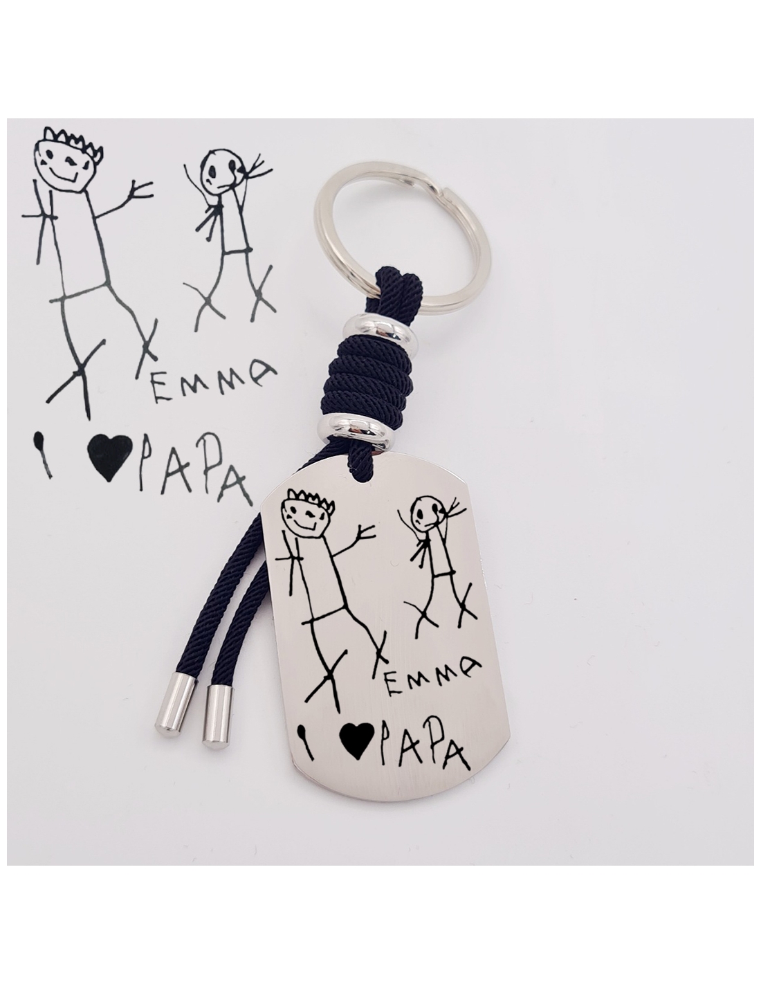 Llavero VENTURA, con dibujo infantil, con toque de color y cordón de milano, acero inoxidable.