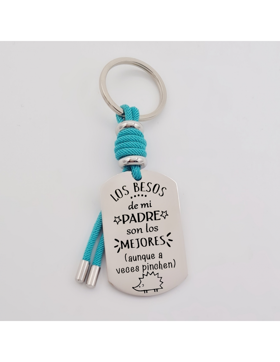 Llavero VENTURA, (Los besos de mi padre, son los mejores, aunque a veces pinchen), cordón de milano, acero inoxidable.