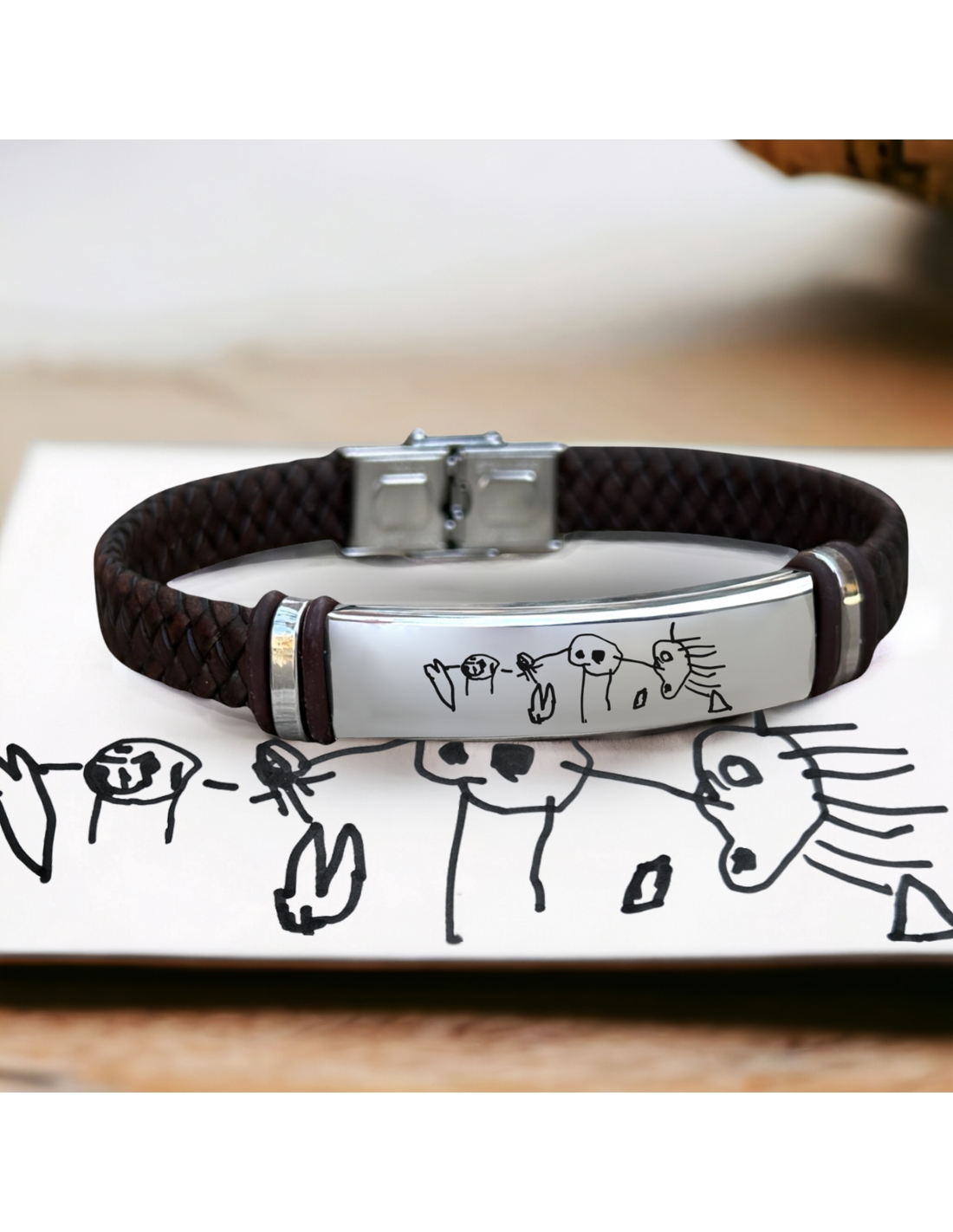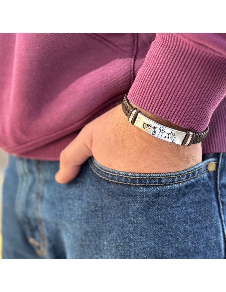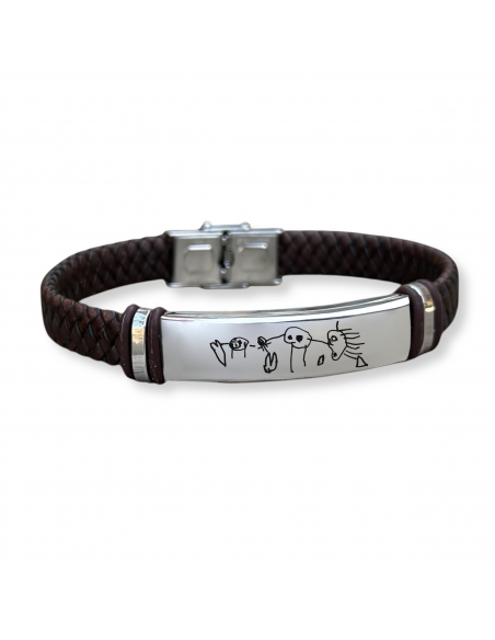 Esta elegante pulsera de cuero trenzado y acero inoxidable es el accesorio perfecto para un regalo único y especial. Su placa metálica permite personalización con la frase o dibujo que desees, convirtiéndola en un detalle exclusivo y significativo.