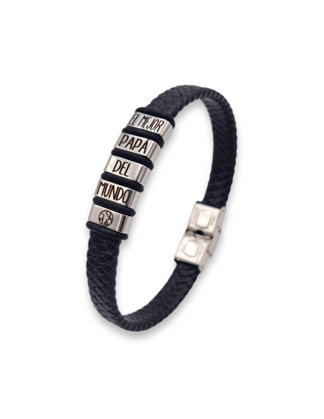 Pulsera con frase, (El mejor papá del mundo) modelo TALY de cuero trenzado, acero inoxidable.