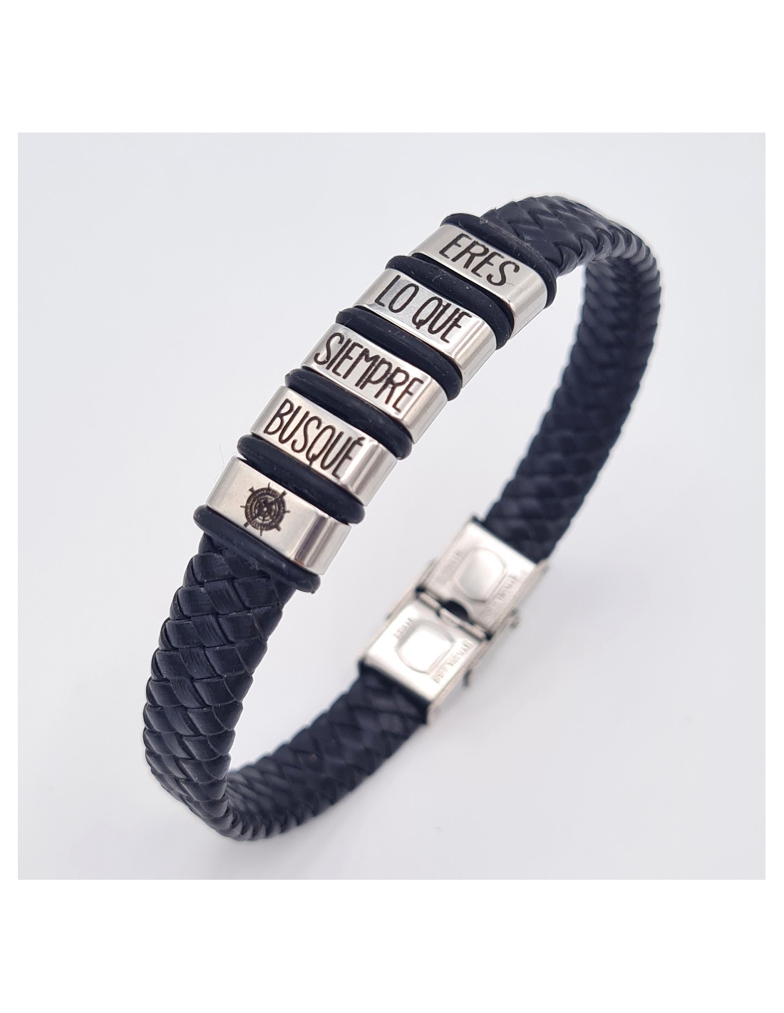 Pulsera con frase, (Eres lo que siempre busqué) modelo TALY de cuero trenzado, acero inoxidable.