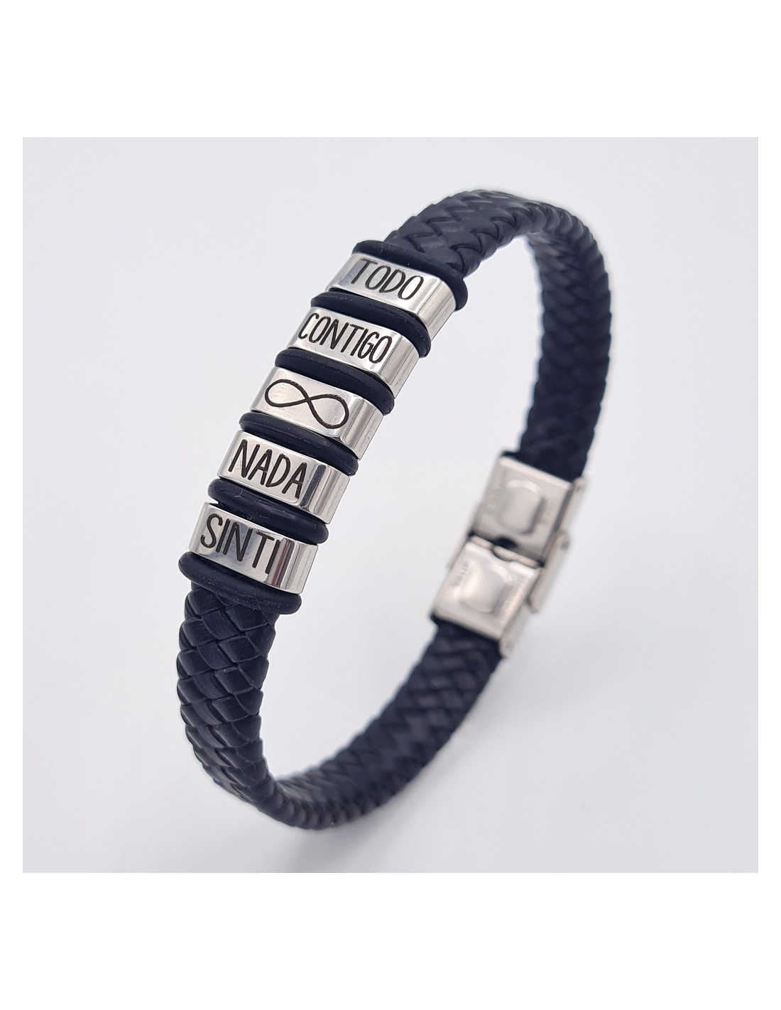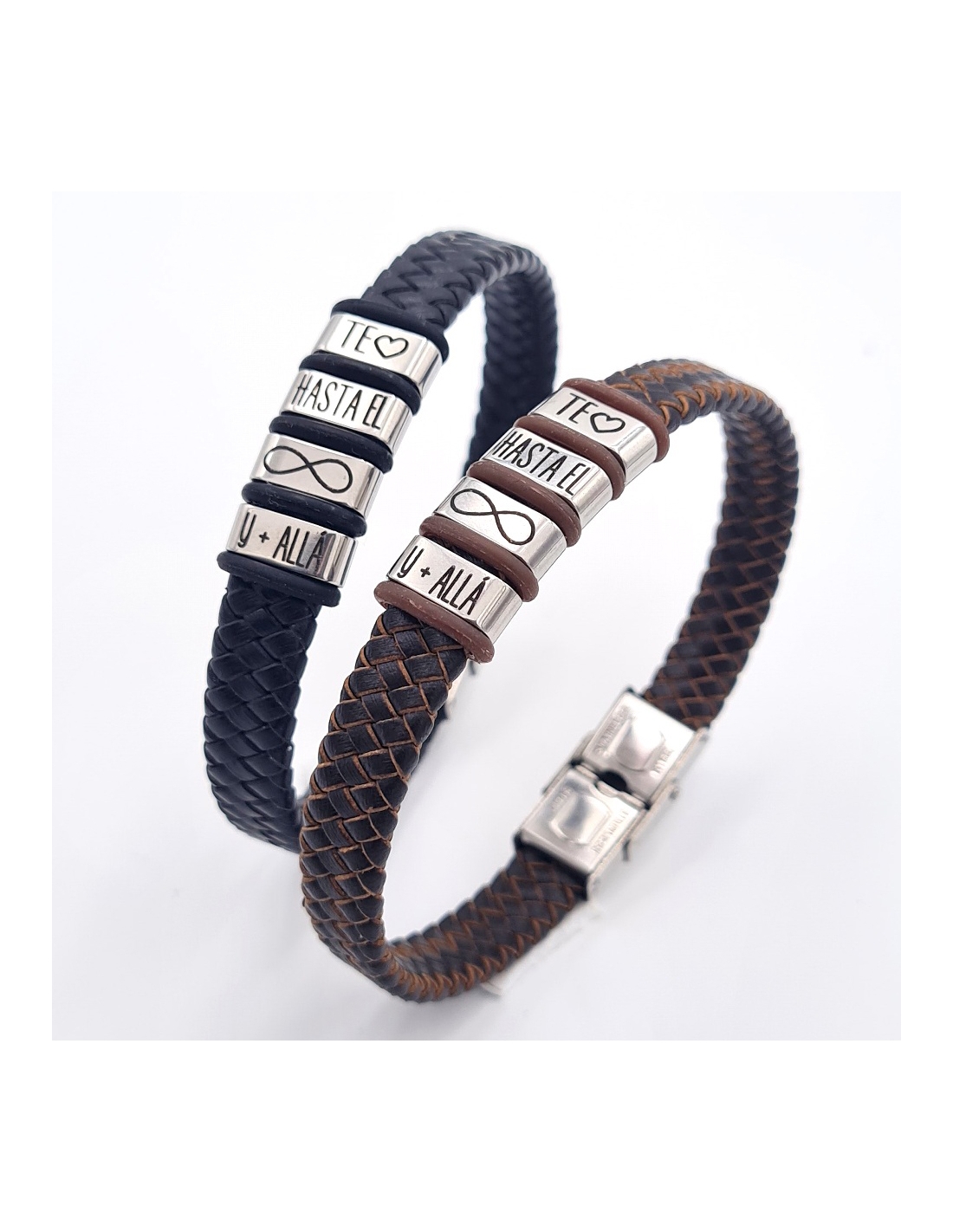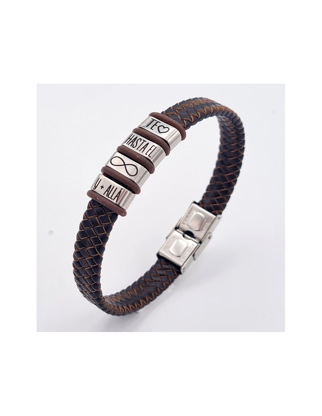 Pulsera con frase, (Te quiero hasta el infinito y más allá) modelo TALY de cuero trenzado, acero inoxidable.