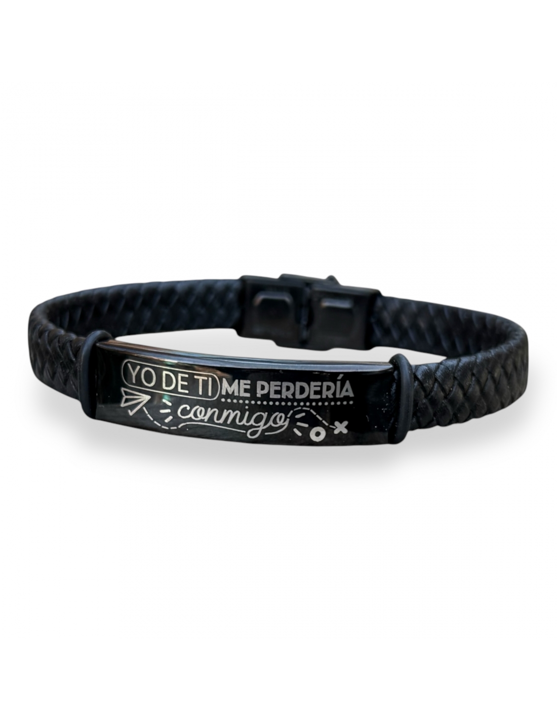 Pulsera (Contigo me iría hasta el quinto pino) modelo BLACK DANIALS de cuero trenzado y de acero inoxidable. Ajustable.