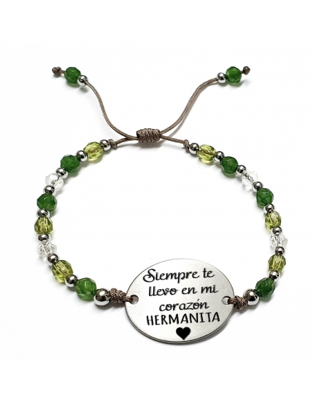 Pulsera AFRODITA, con frase (Siempre te llevo en mi corazón hermanita) ajustable.