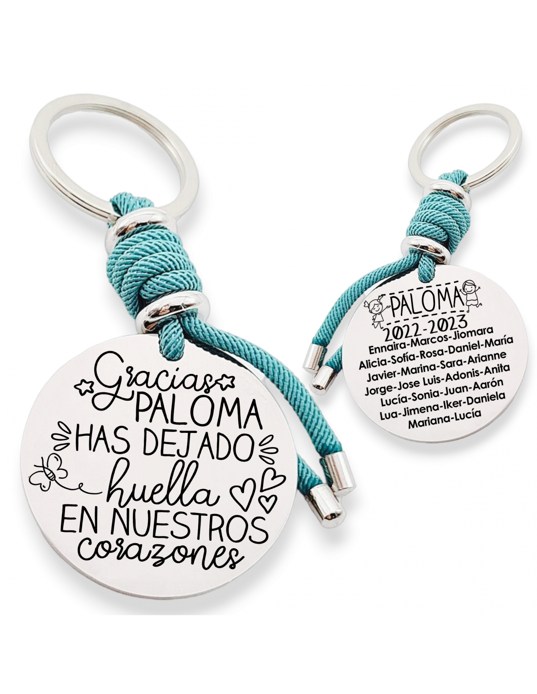 Llavero VENTURA-2, (Gracias Paloma has dejado huella en nuestros corazones), cordón de milano, acero inoxidable.