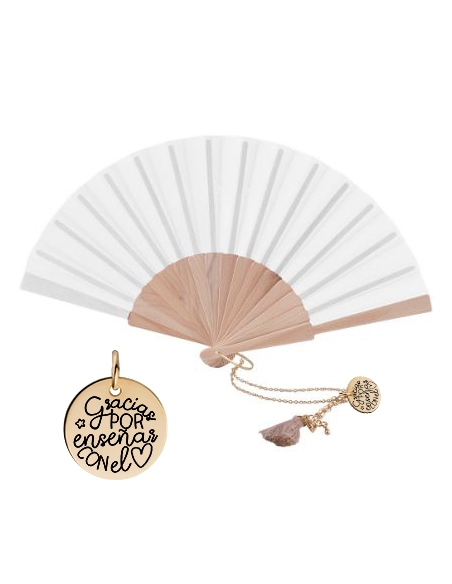 Un detalle elegante, útil y con un mensaje muy especial para agradecer a las profesoras al final del curso. Este set incluye un abanico de madera natural con tela (blanca o negra) y una cadena decorativa con medalla dorada grabada con una frase emotiva.