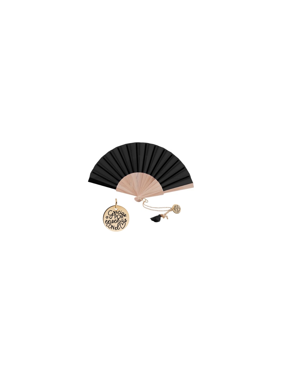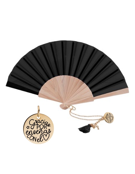 Un detalle elegante, útil y con un mensaje muy especial para agradecer a las profesoras al final del curso. Este set incluye un abanico de madera natural con tela (blanca o negra) y una cadena decorativa con medalla dorada grabada con una frase emotiva.