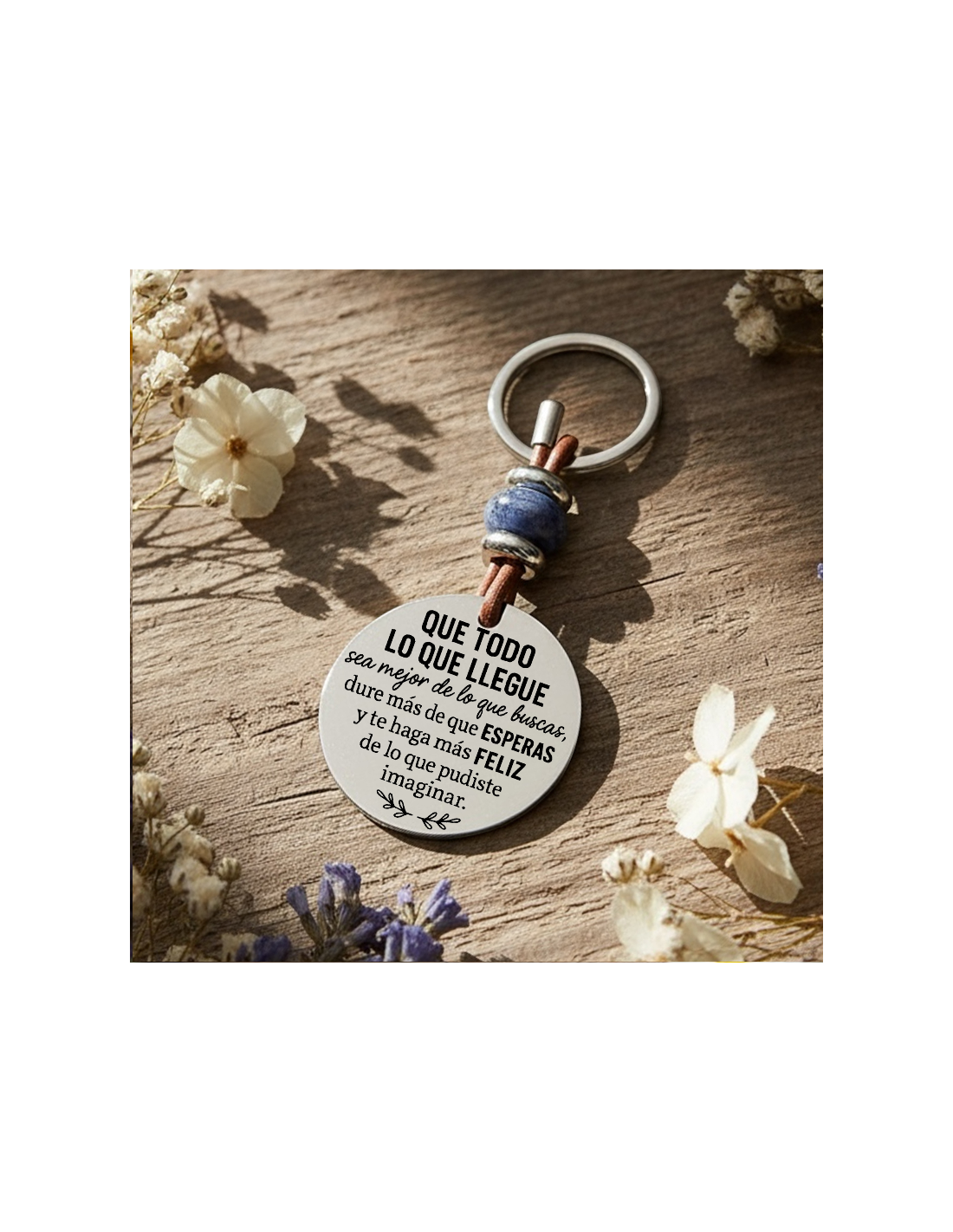 Llavero “Que todo lo que llegue” con piedras naturales. Regalo con energía positiva y buenos deseos.