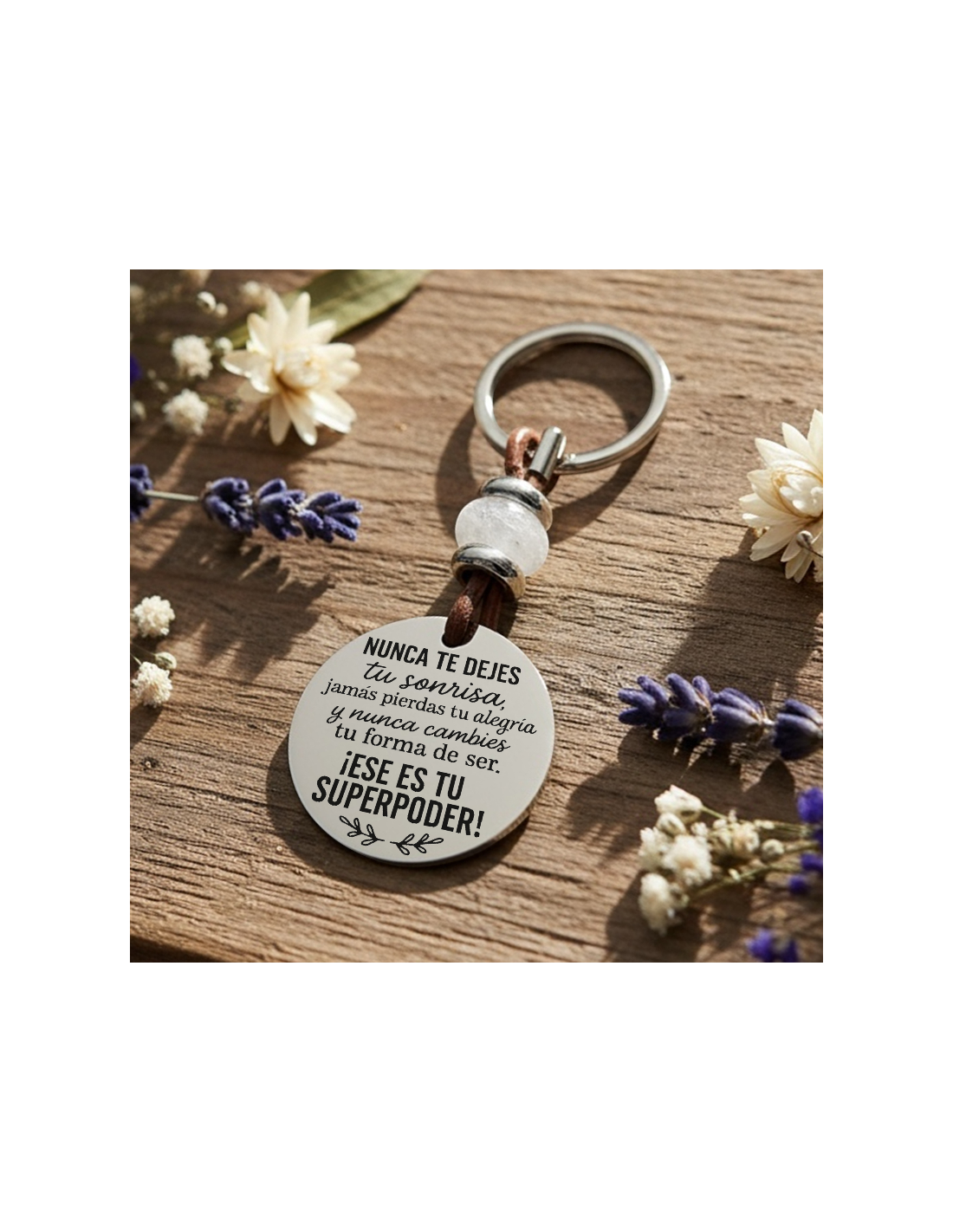 Llavero “Nunca te dejes tu sonrisa, jamás pierdas tu alegría y nunca cambies tu forma de ser. ¡Ese es tu superpoder!” con piedra mineral natural.