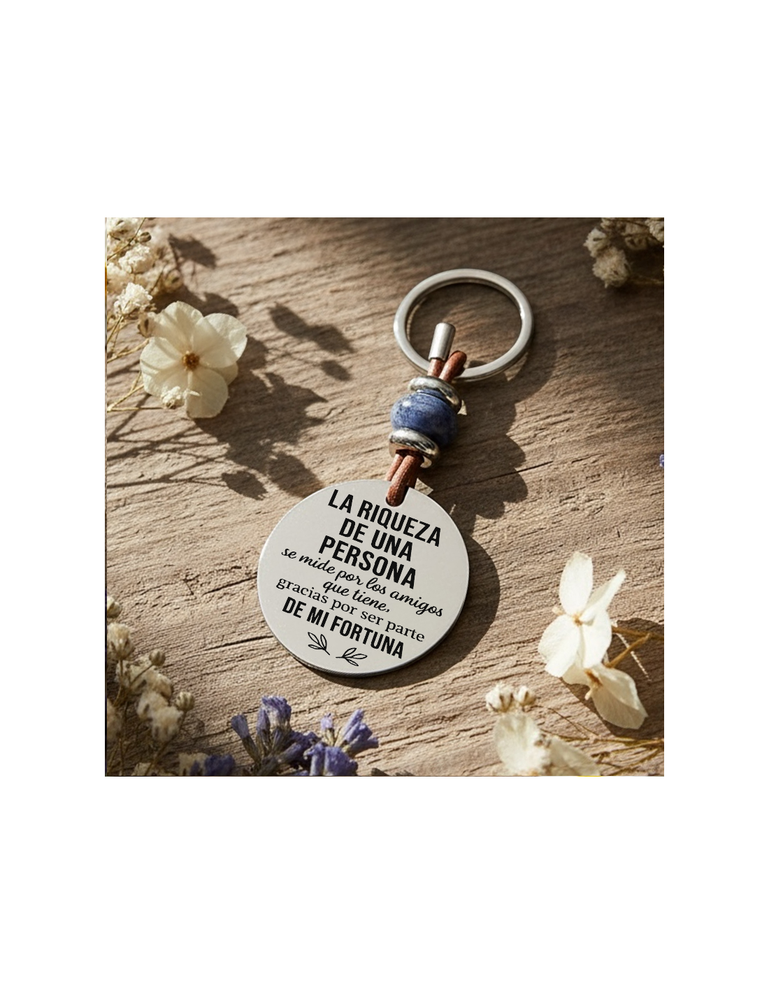 Llavero “La riqueza de una persona se mide por los amigos que tiene, gracias por ser parte de mi fortuna.” con piedra mineral natural