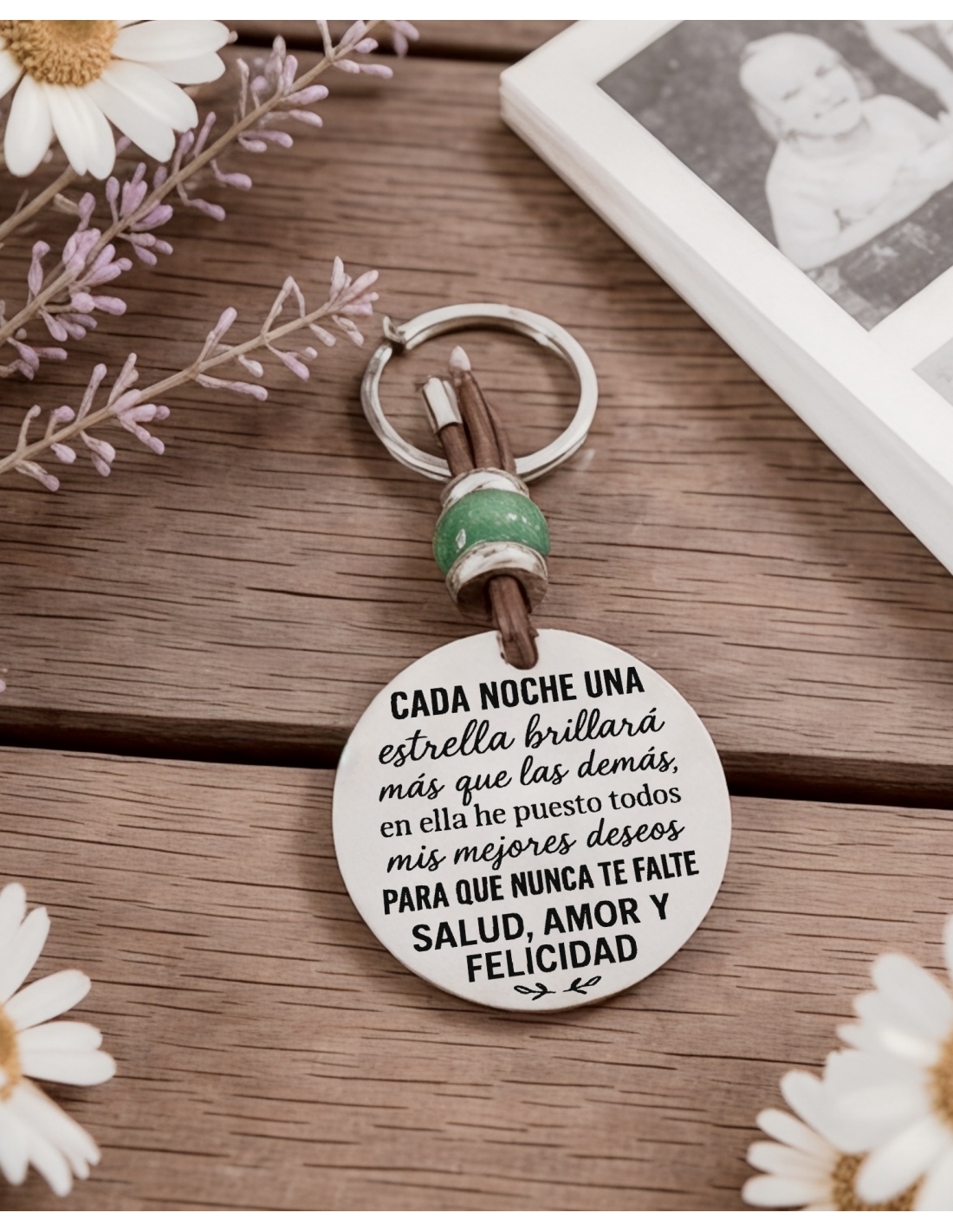 Llavero “Cada noche una estrella brillará más que las demás, en ella he puesto todos mis mejores deseos para que nunca te falte salud, amor y felicidad.” con piedra mineral natural.