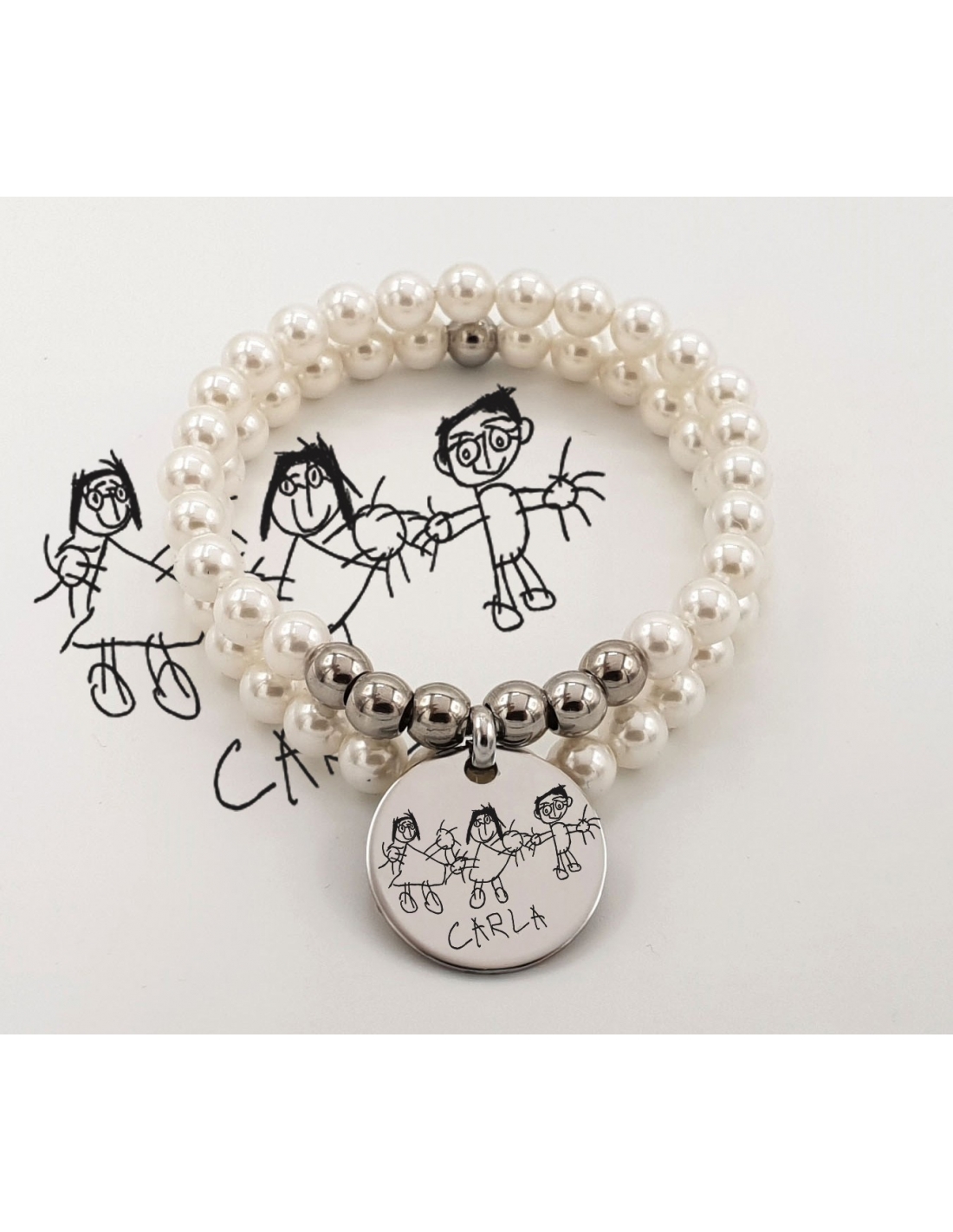 Pulsera modelo D'PERLAS 2, dibujo infantil, montada con perlas de vidrio nacaradas, elástica.