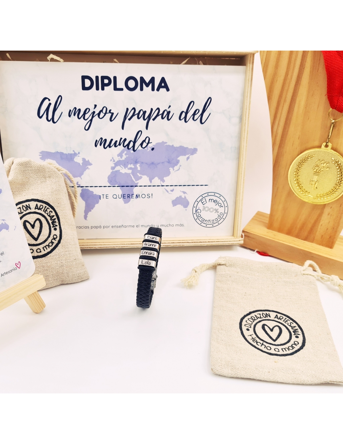KIT Regalo Papá MOD 1 (Pulsera con Nombres) Incluye caja, medalla y diploma.
