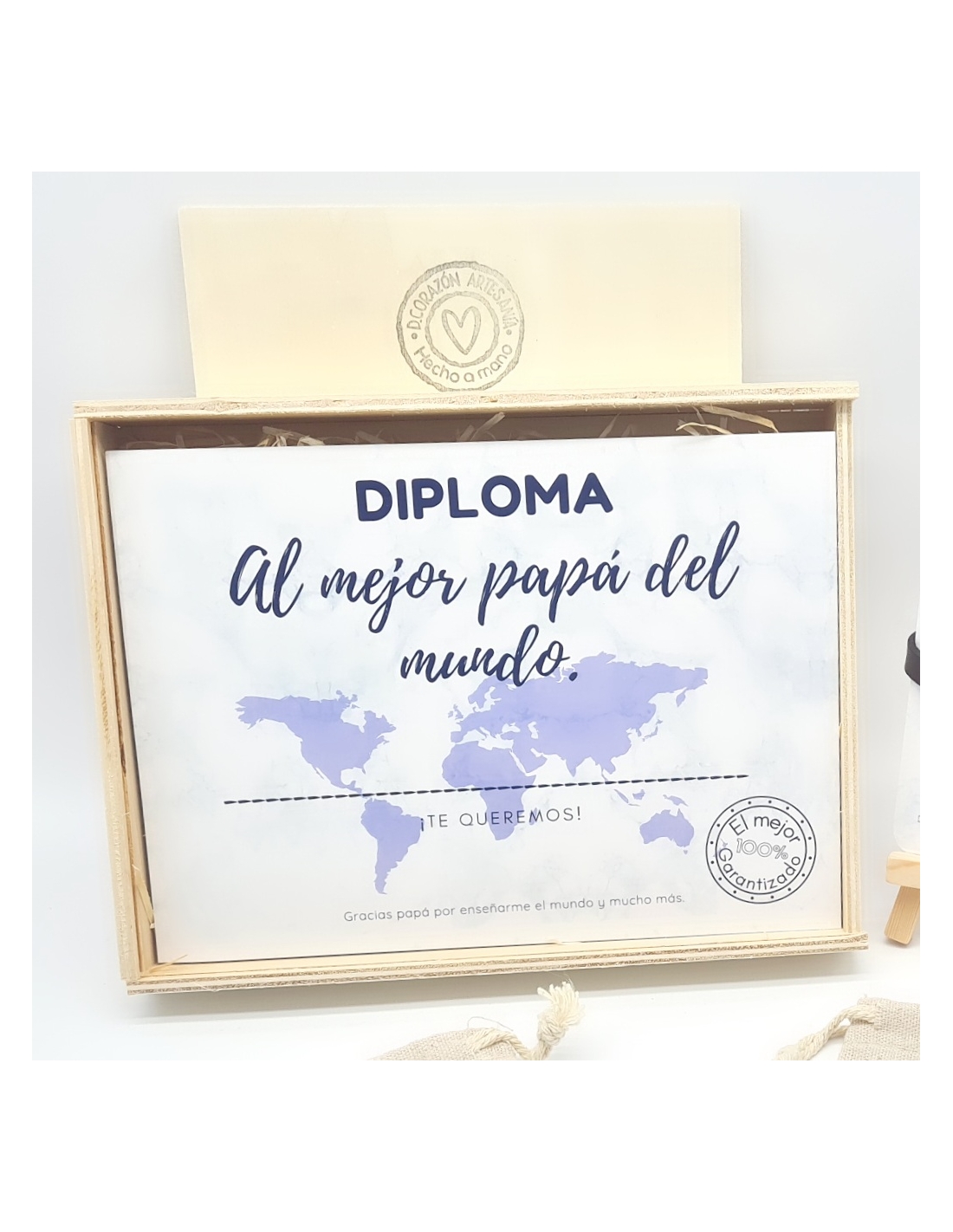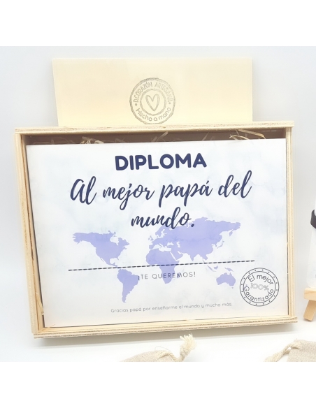Incluye caja de madera, diploma, medalla y pulsera con nombres personalizada.