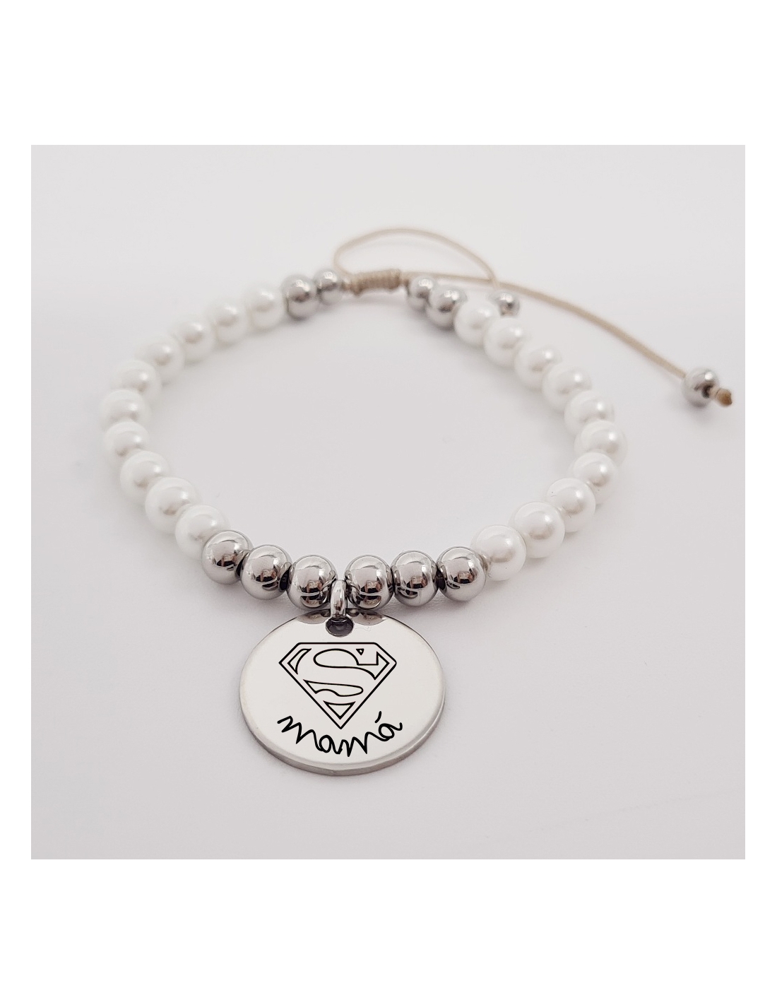 Pulsera modelo NACALA, con frases para mamá, montada con perlas de vidrio nacaradas, elástica.