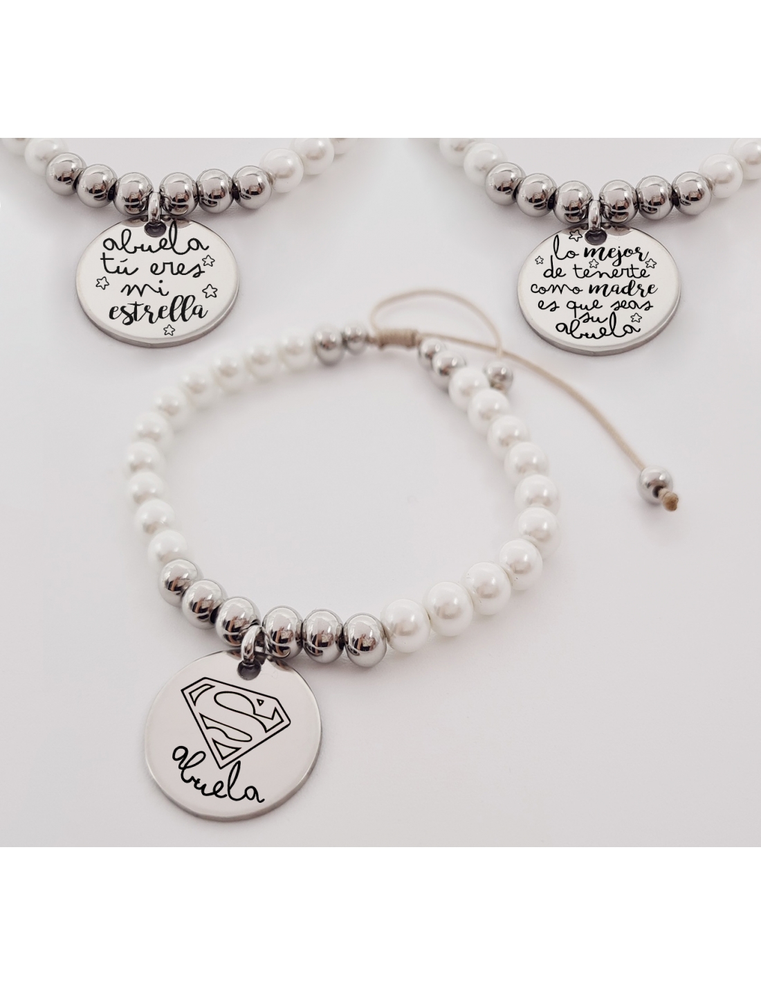 Pulsera modelo NACALA, con frases para abuela, montada con perlas de vidrio nacaradas, elástica.