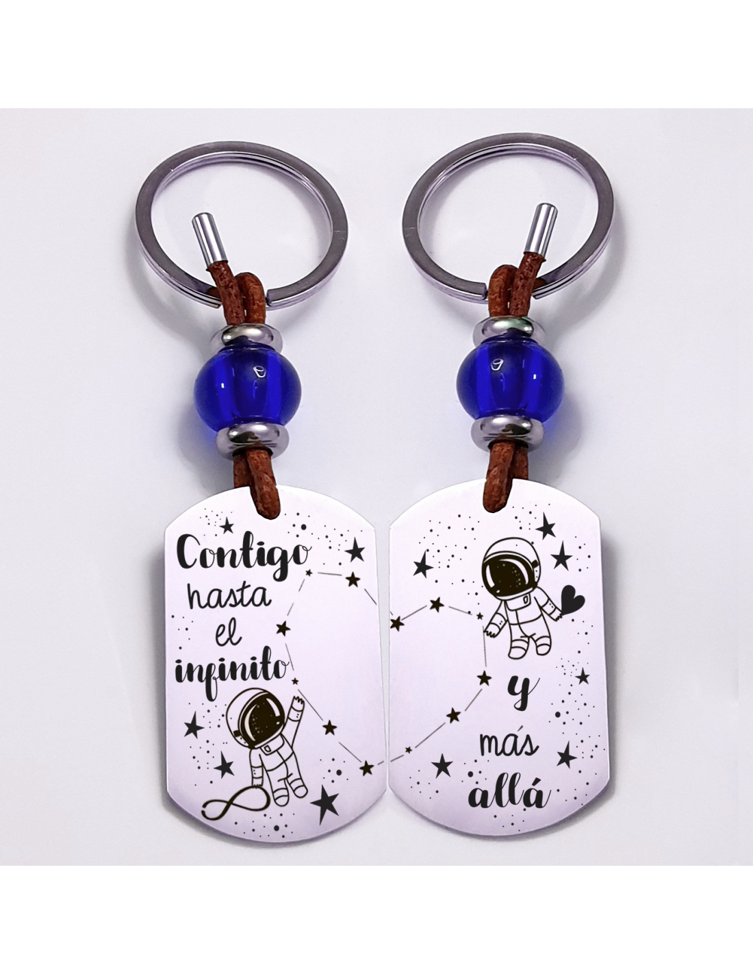 Conjunto DUO ASTRONAUTAS, dos llaveros con frase (Hasta el infinito y más allá).