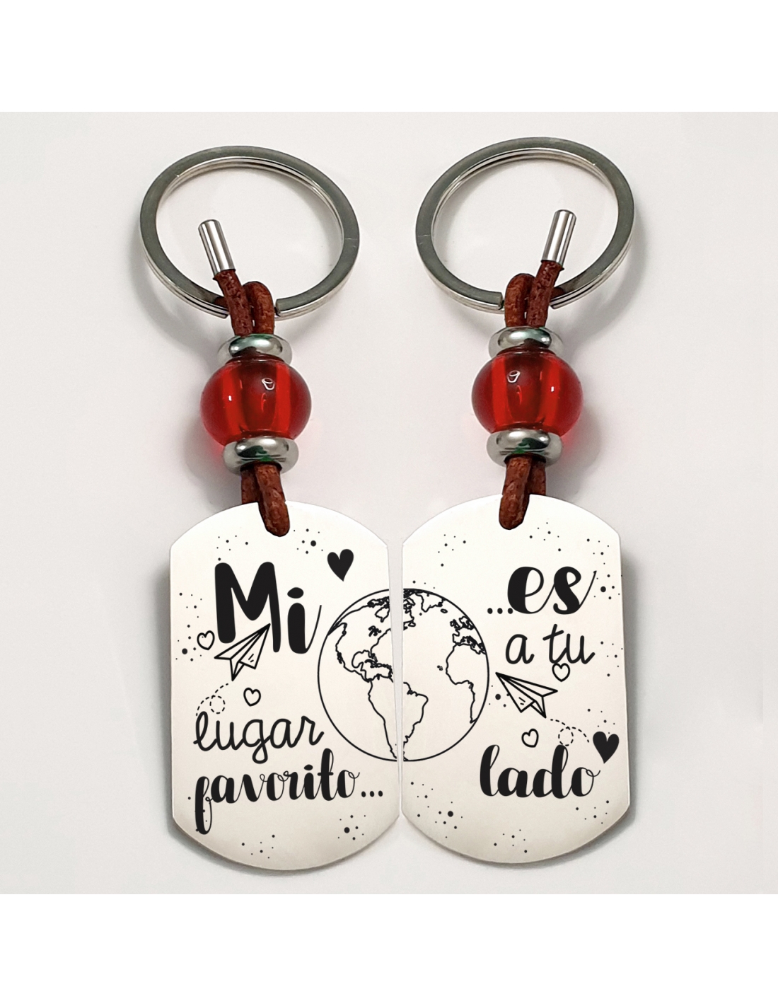 Conjunto DUO A TU LADO, dos llaveros con frase (Mi sitio favorito, es a tu lado).