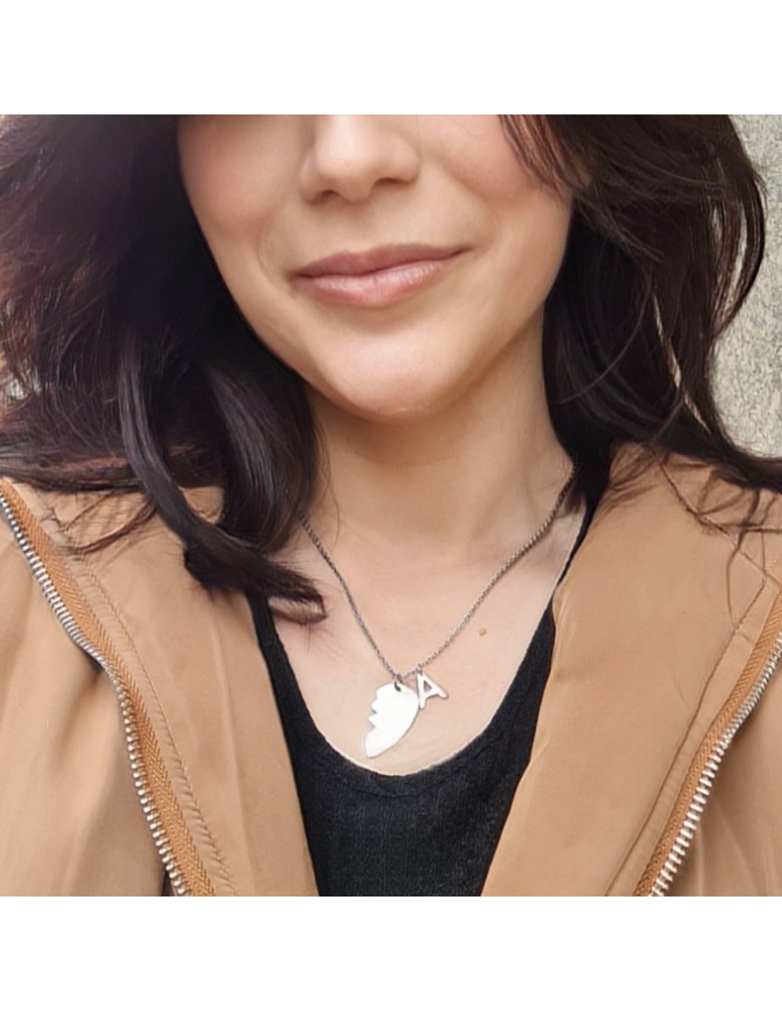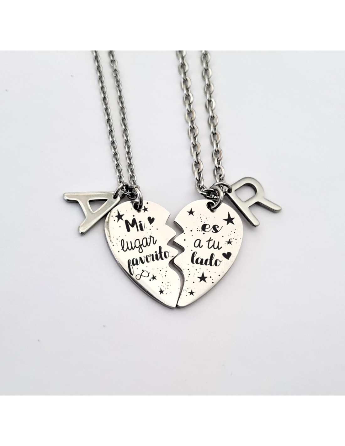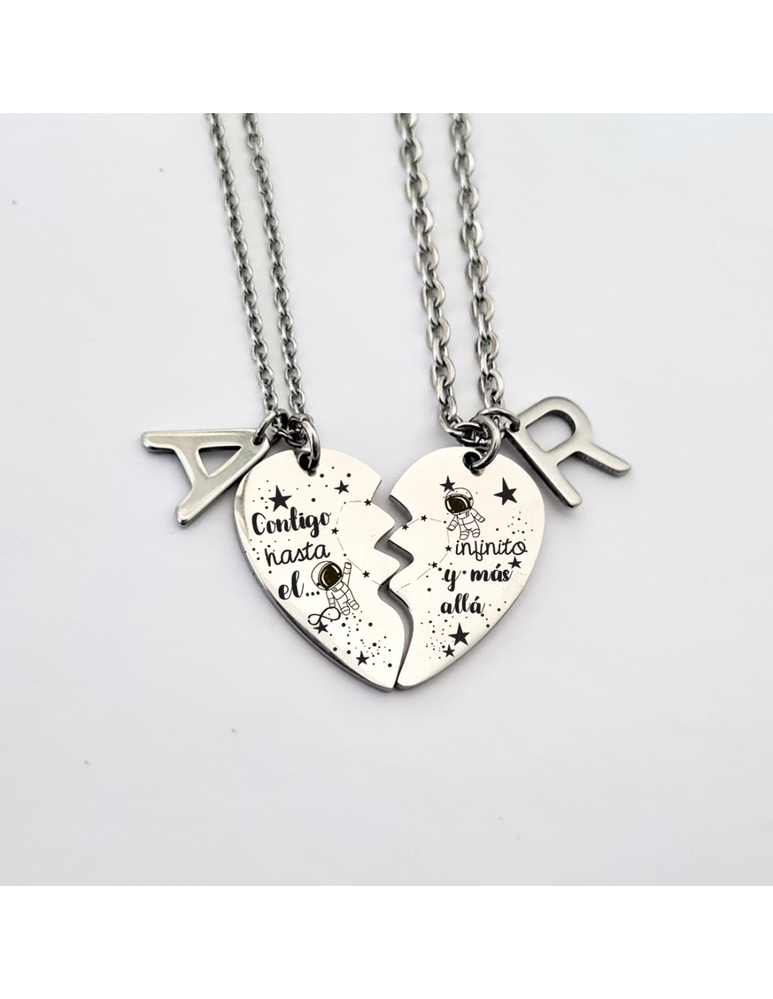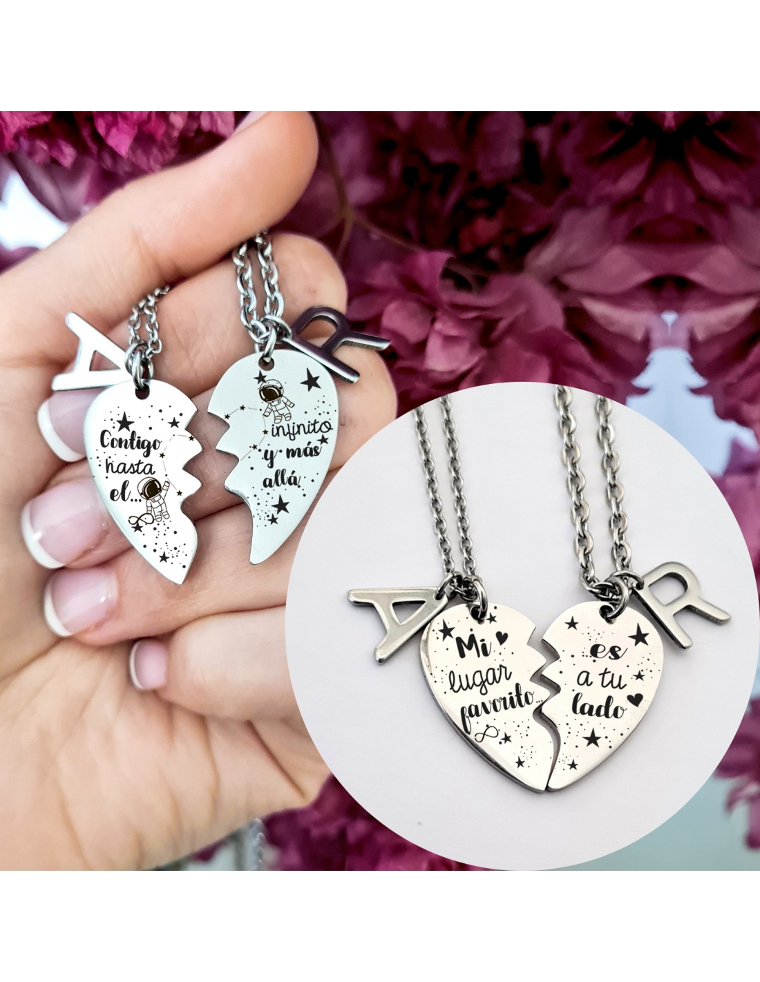 AMORE2 es un collar que te da opción de elegir el grosor de la cadena y el largo que quieres, de cada medio corazón, con un mensaje predefinido o personalizado y elegir las iniciales a colgar, tan sólo rellena los campos de texto..