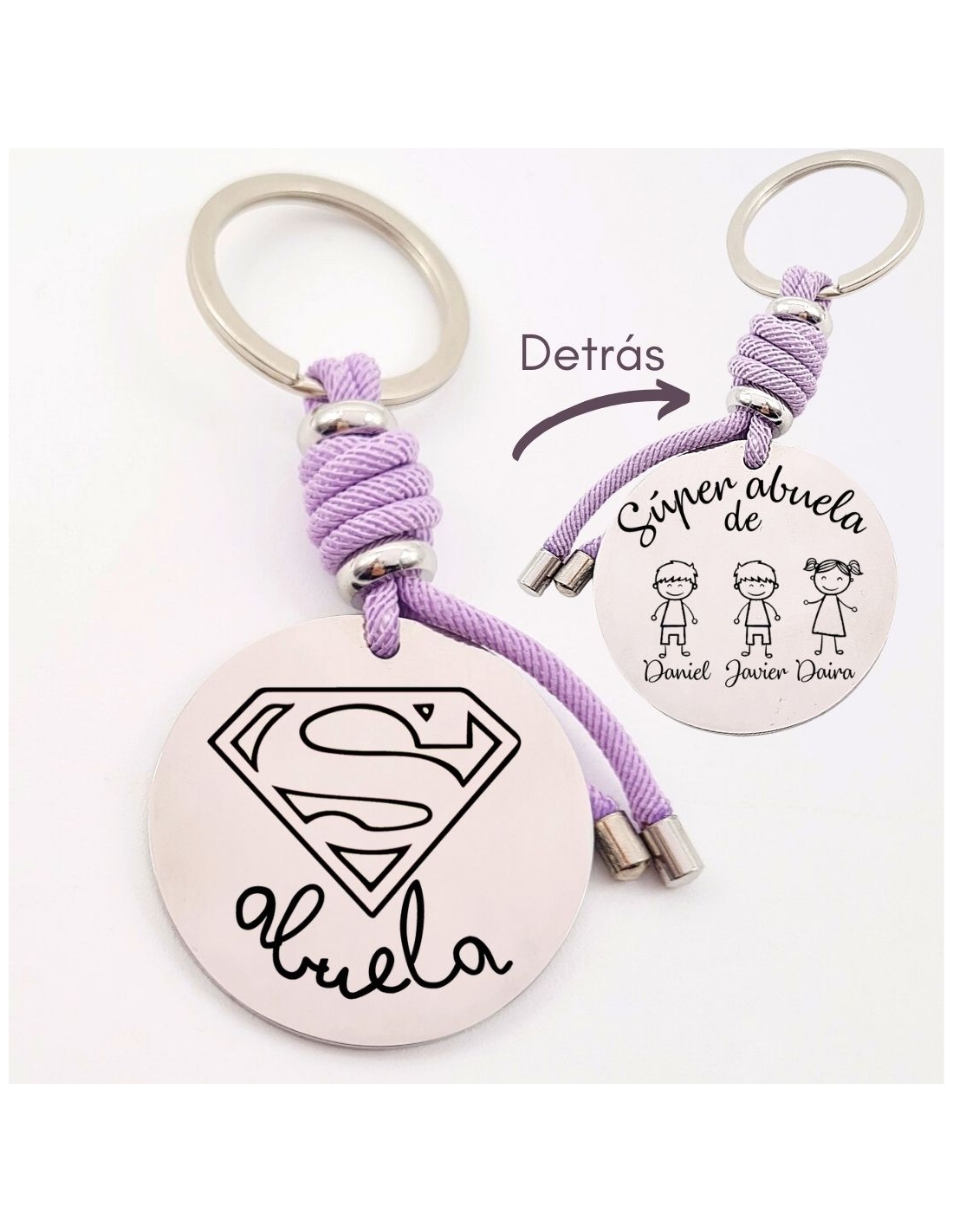 Llavero SÚPER ABUELA, con los nombres de los nietos, modelo VENTURA-2 de acero inoxidable, con cordón de MILANO.