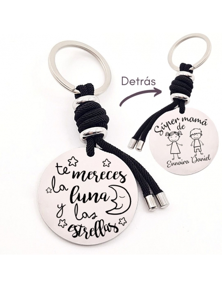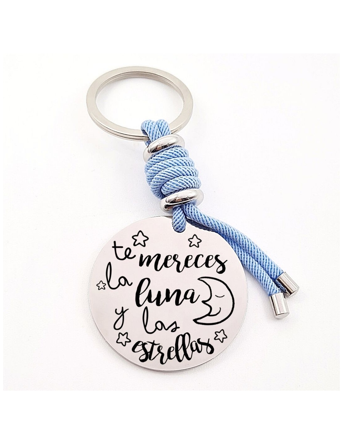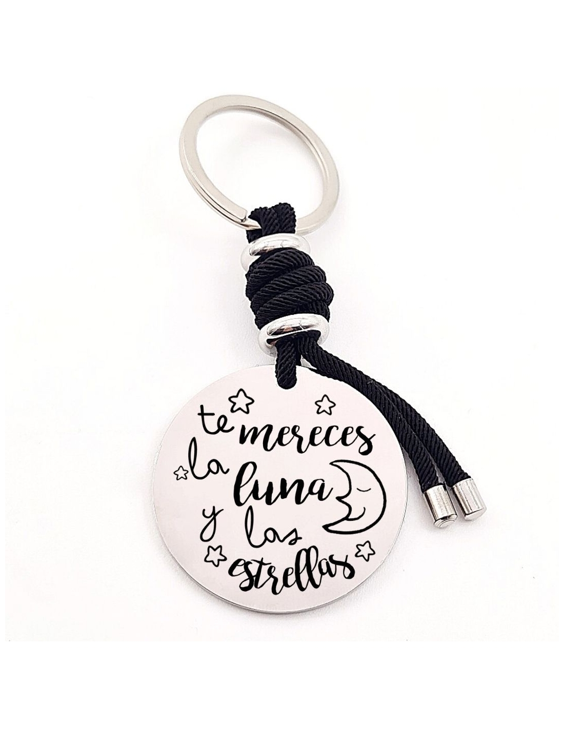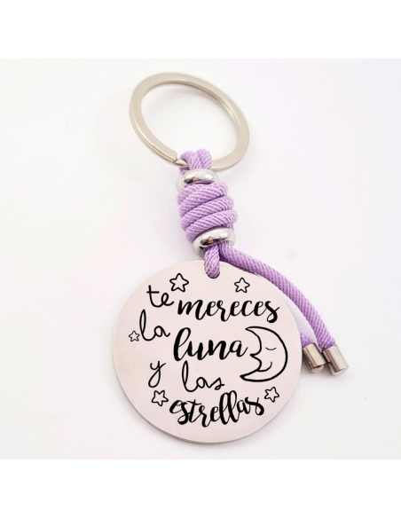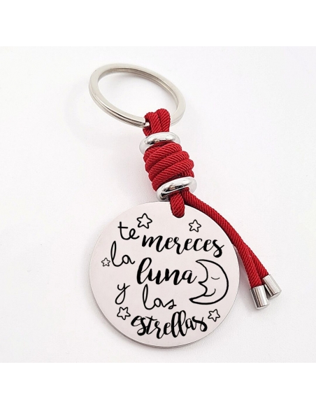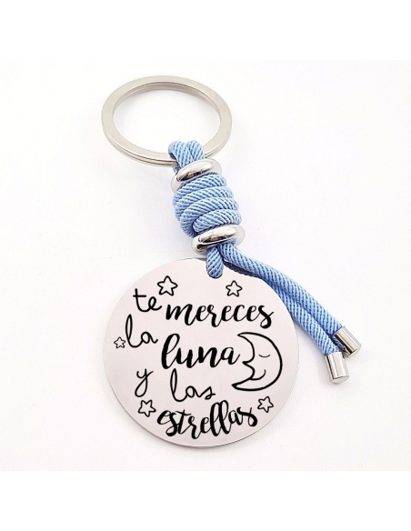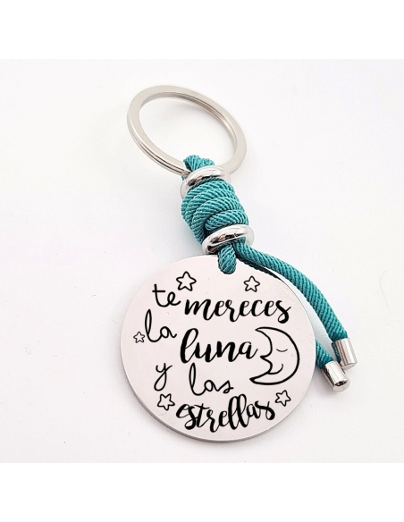 Llavero con frase (Te mereces la luna y las estrellas), personaliza con una dedicatoria, modelo VENTURA-2 de acero inoxidable.