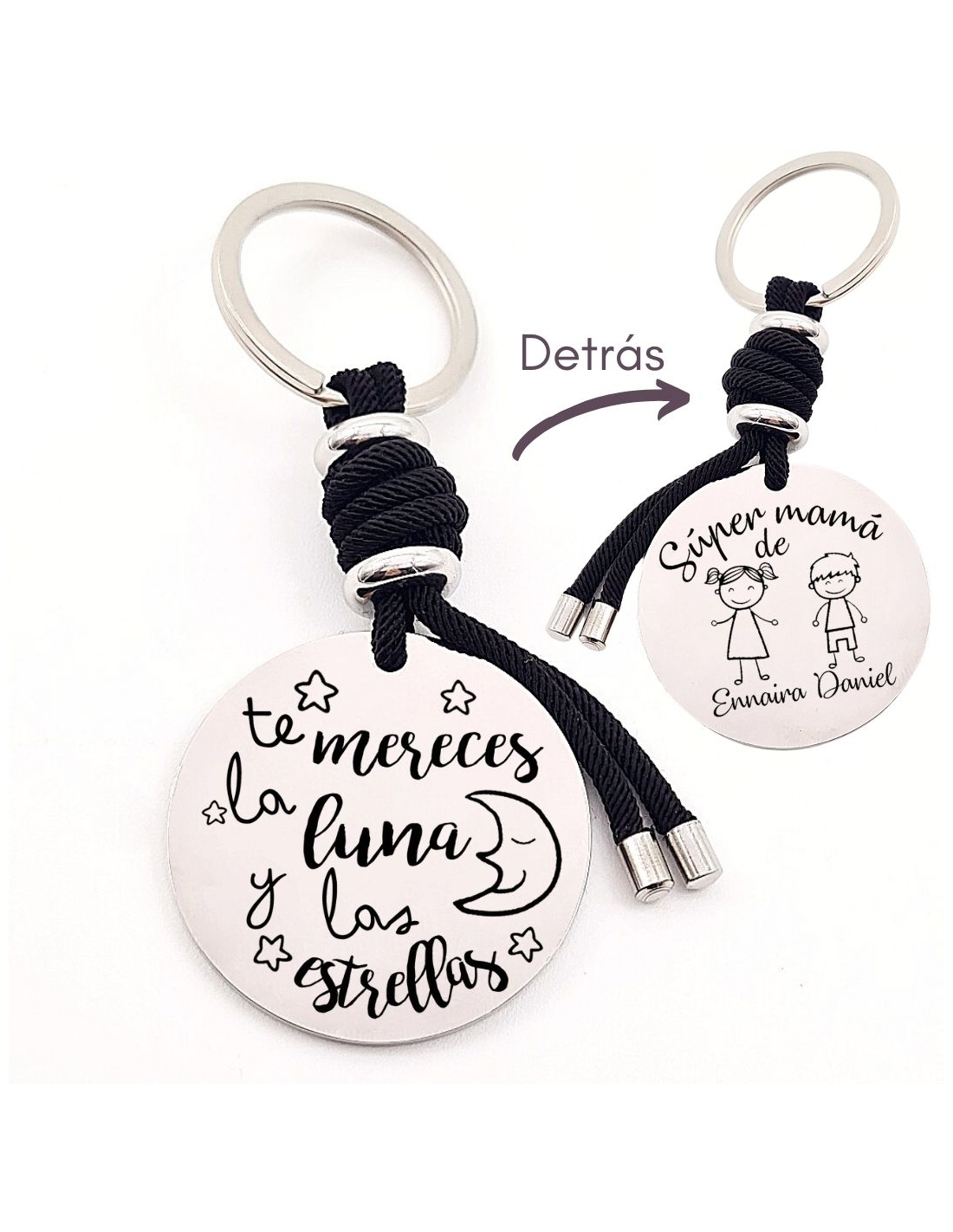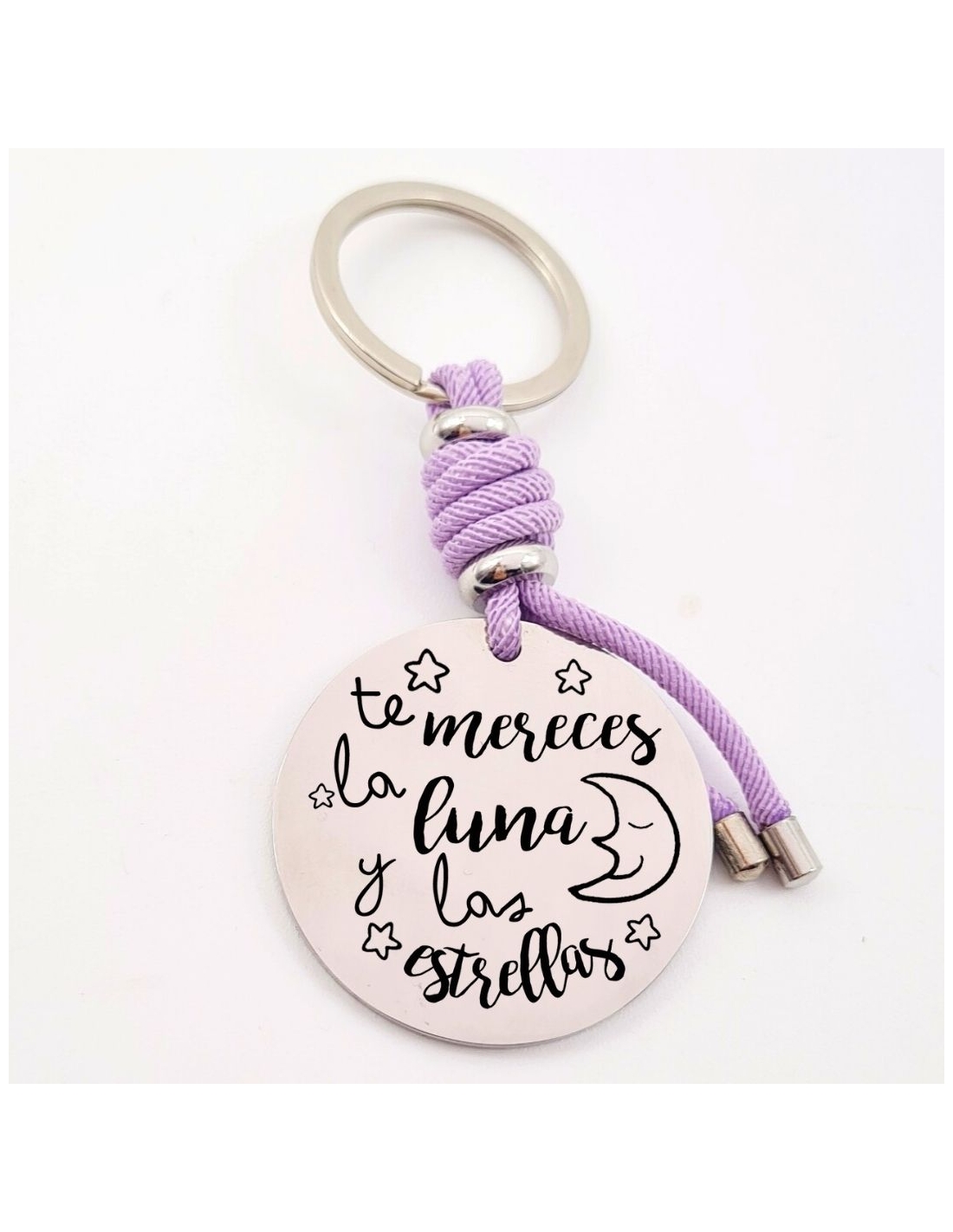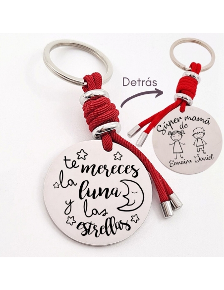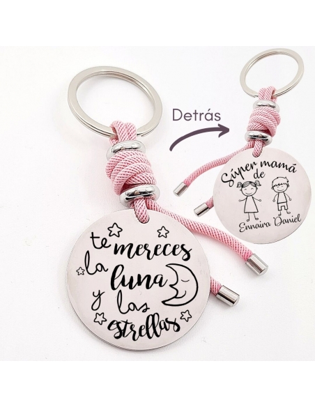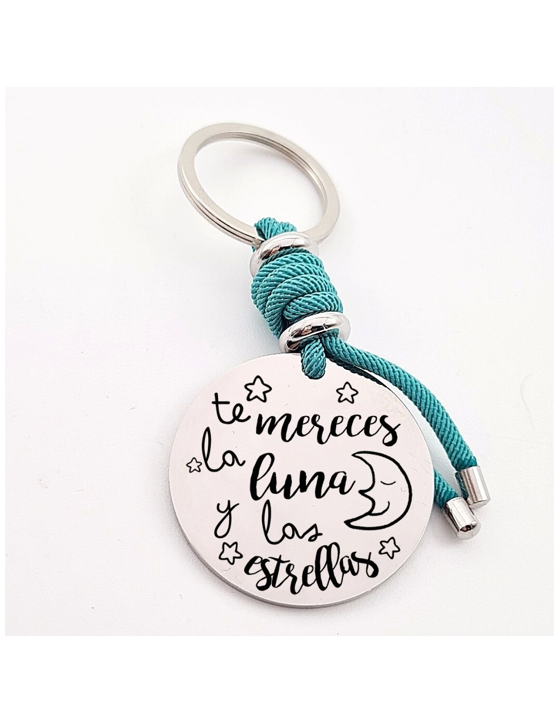 Llavero con frase (Te mereces la luna y las estrellas), personaliza con una dedicatoria, modelo VENTURA-2 de acero inoxidable.
