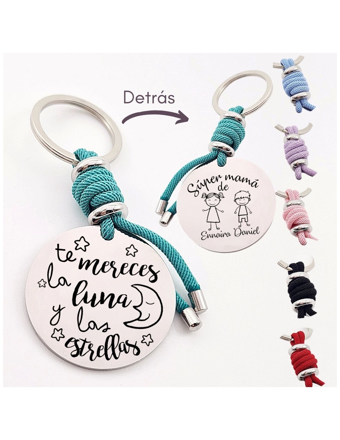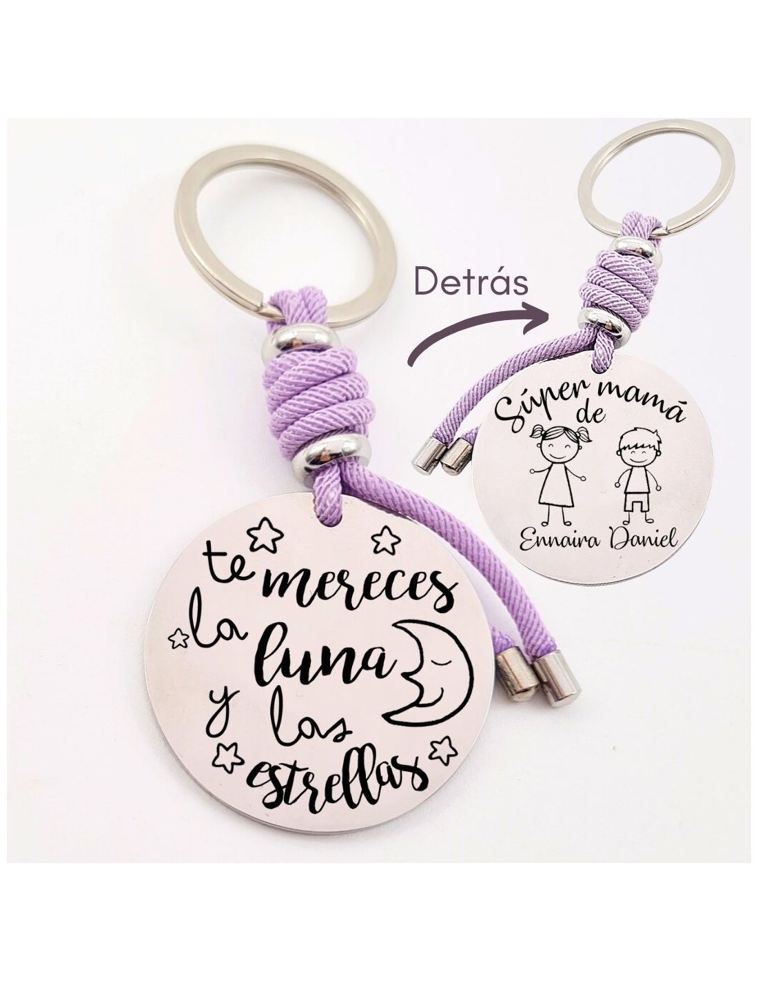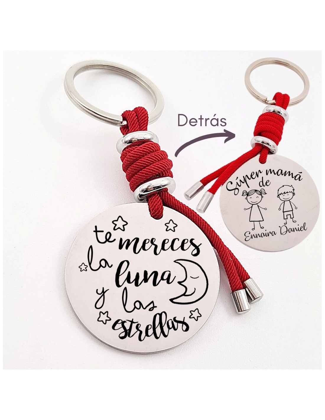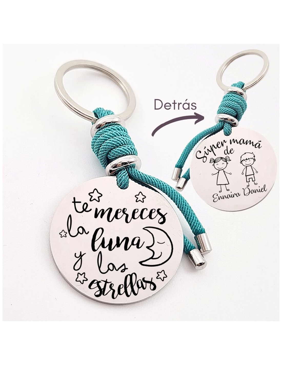 Llavero con frase (Te mereces la luna y las estrellas), personaliza con una dedicatoria, modelo VENTURA-2 de acero inoxidable.