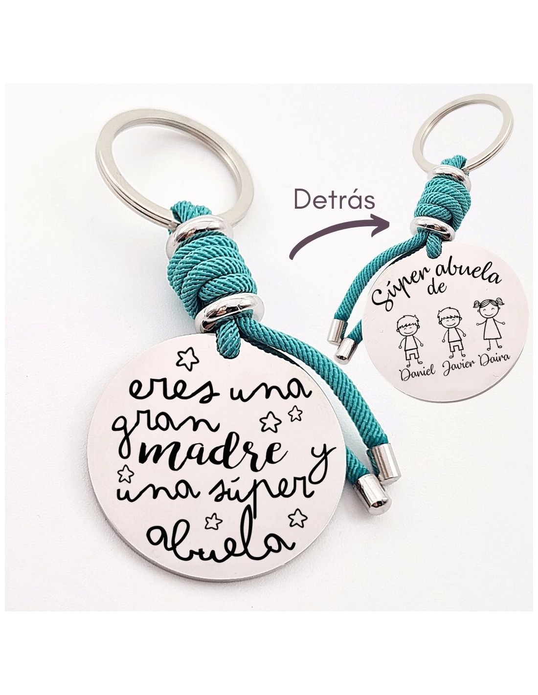 Llavero con frase, (Eres una gran madre y super abuela) con los nombres de los nietos, modelo VENTURA-2 de acero inoxidable.