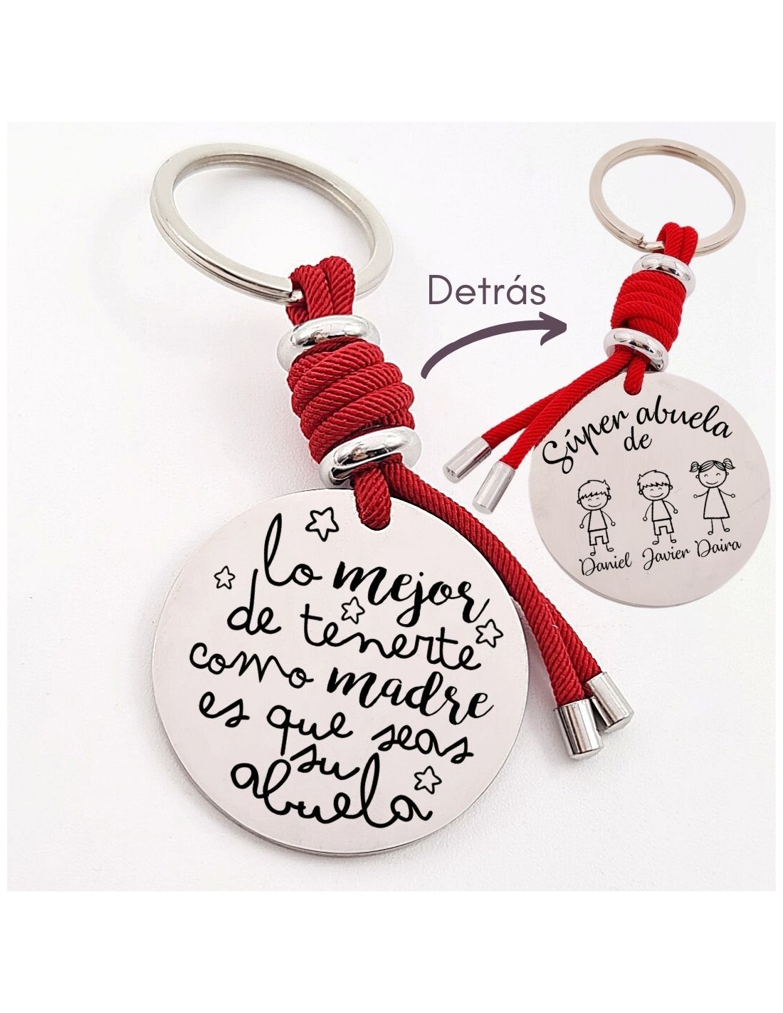 Llavero con frase, (Lo mejor de tenerte como madre, es que) con los nombres de los nietos, modelo VENTURA-2 de acero inoxidable.
