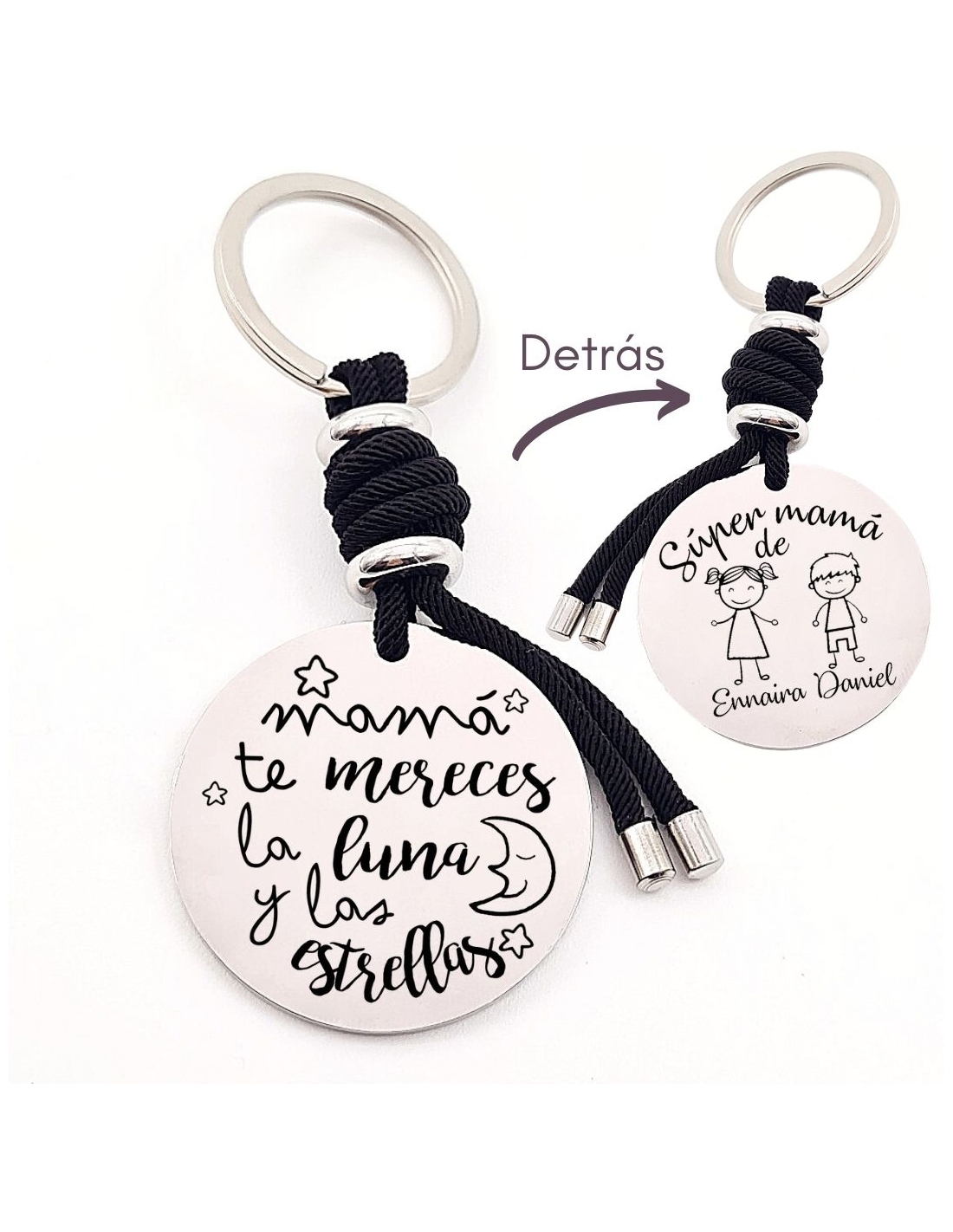 Llavero con frase, (Mamá te mereces la luna y las) con los nombres de los nietos, modelo VENTURA-2 de acero inoxidable.