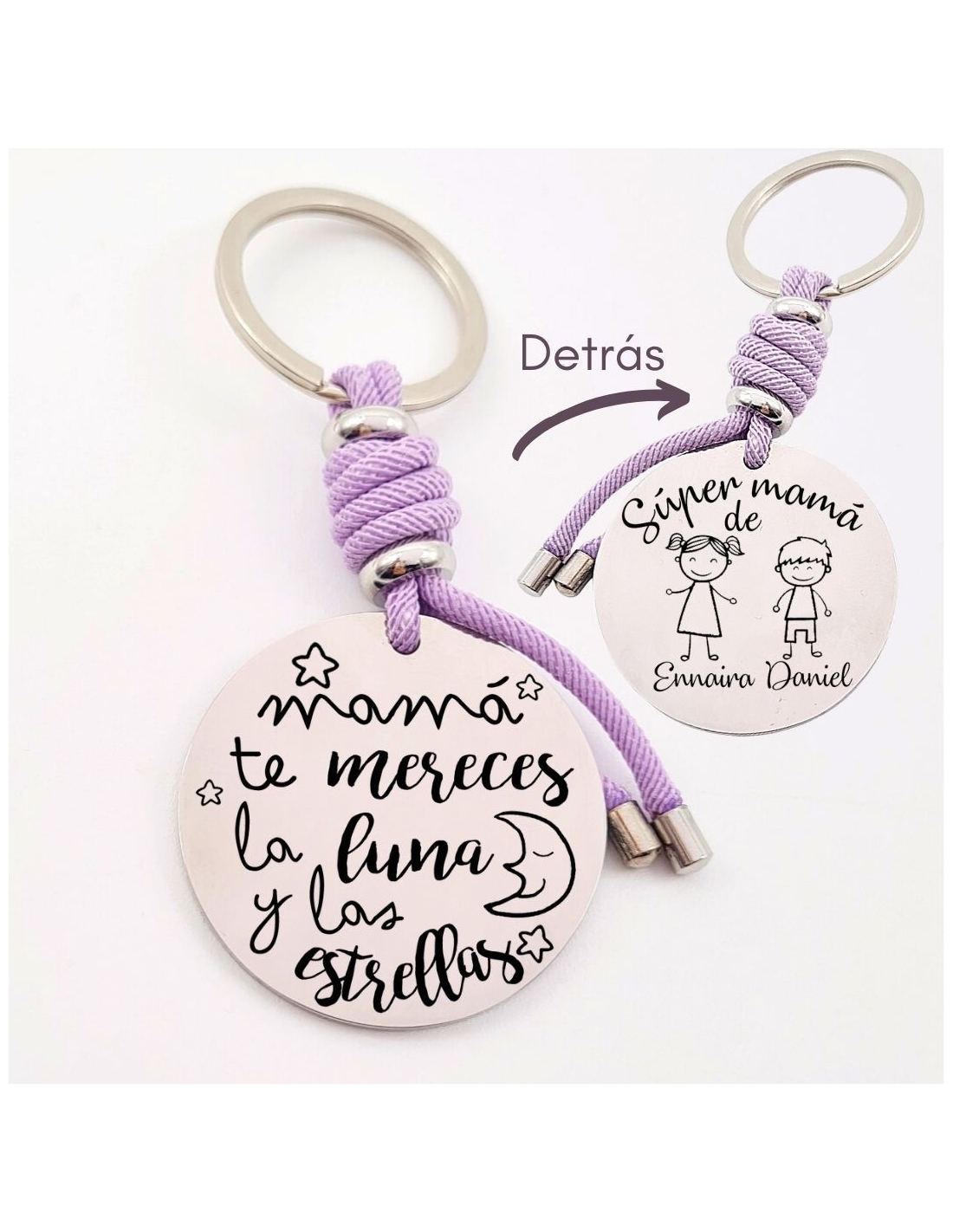 Llavero con frase, (Mamá te mereces la luna y las) con los nombres de los nietos, modelo VENTURA-2 de acero inoxidable.