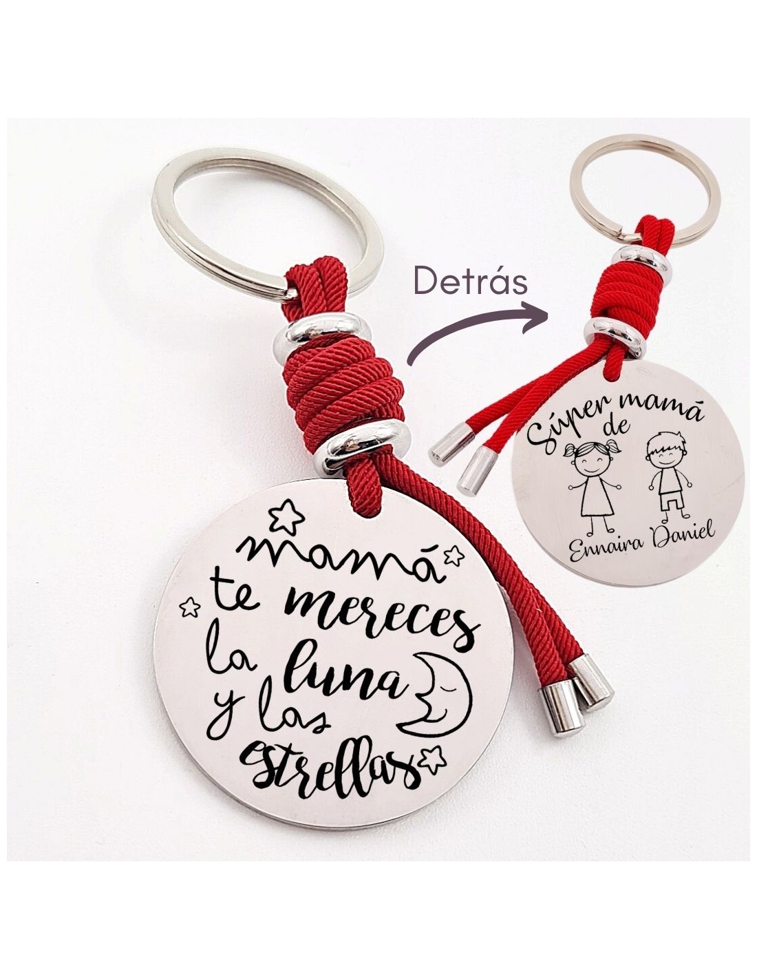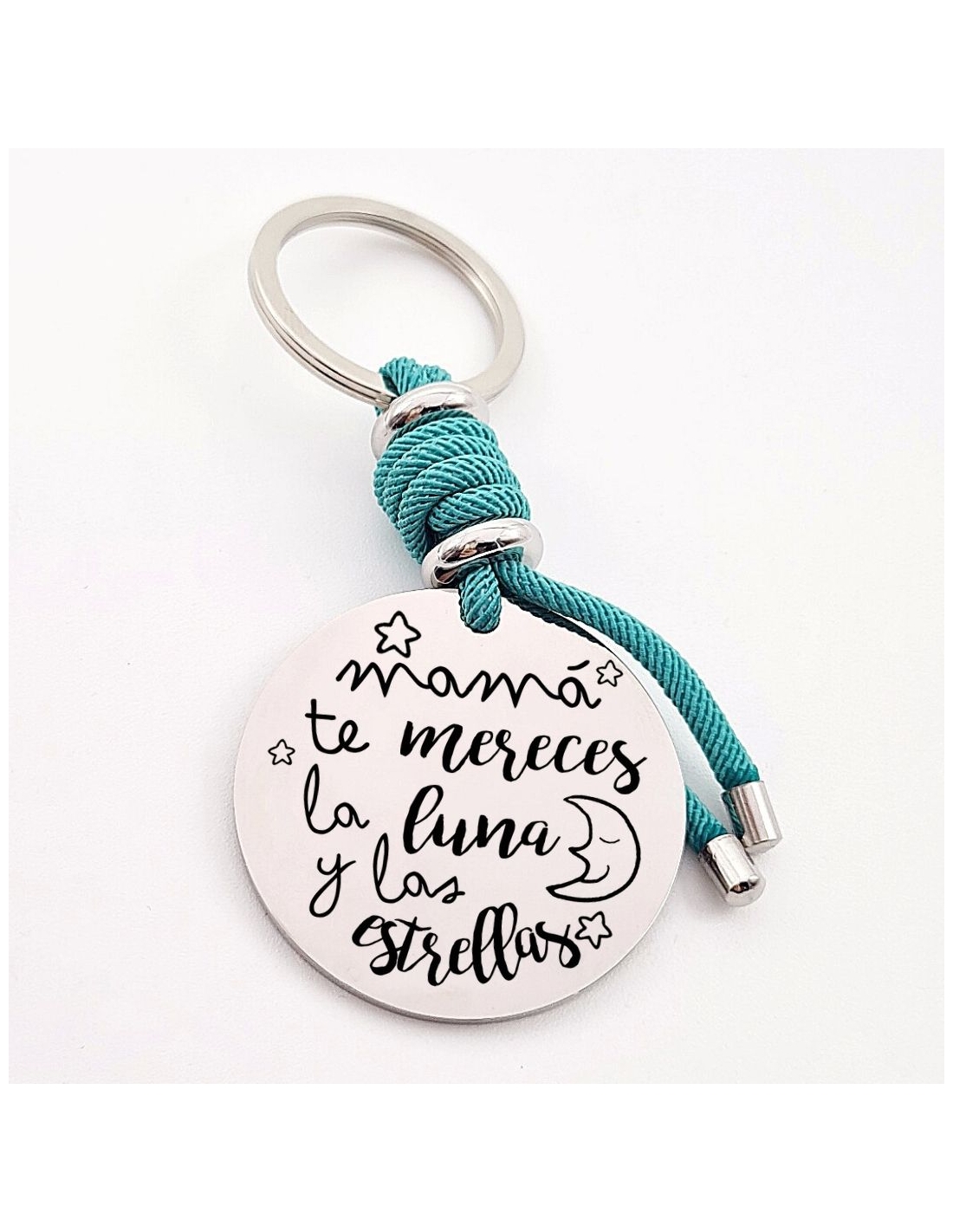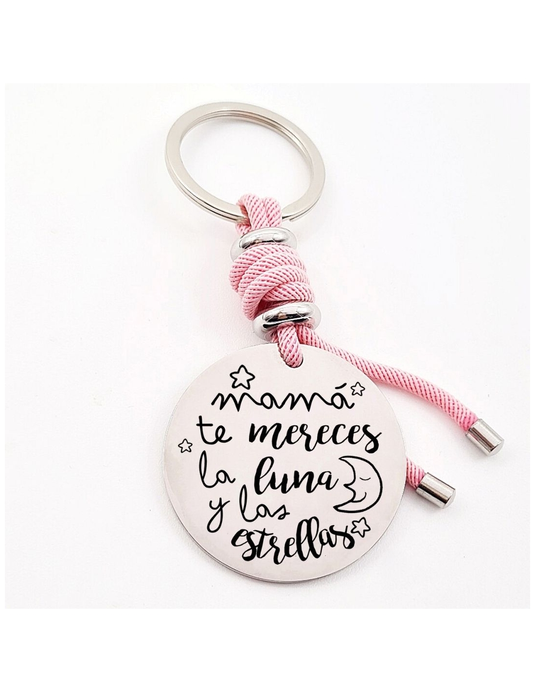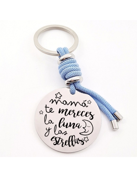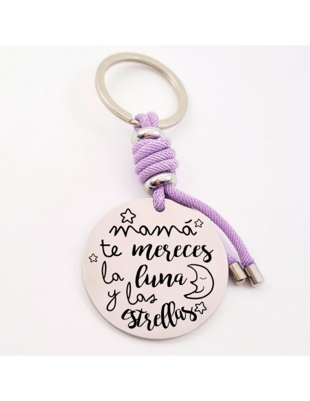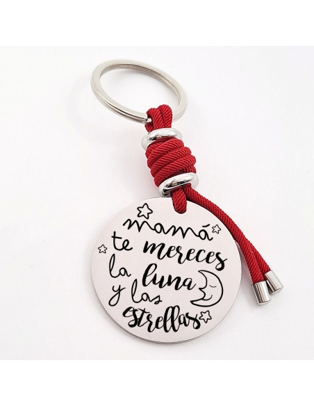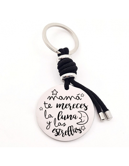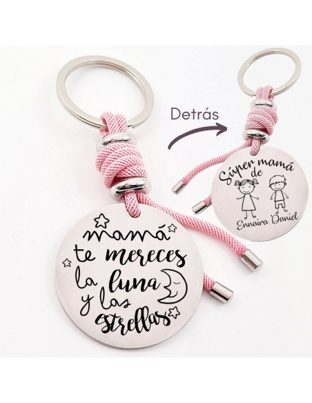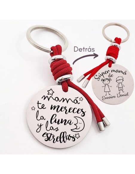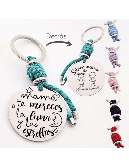 Llavero con frase, (Mamá te mereces la luna y las) con los nombres de los nietos, modelo VENTURA-2 de acero inoxidable.