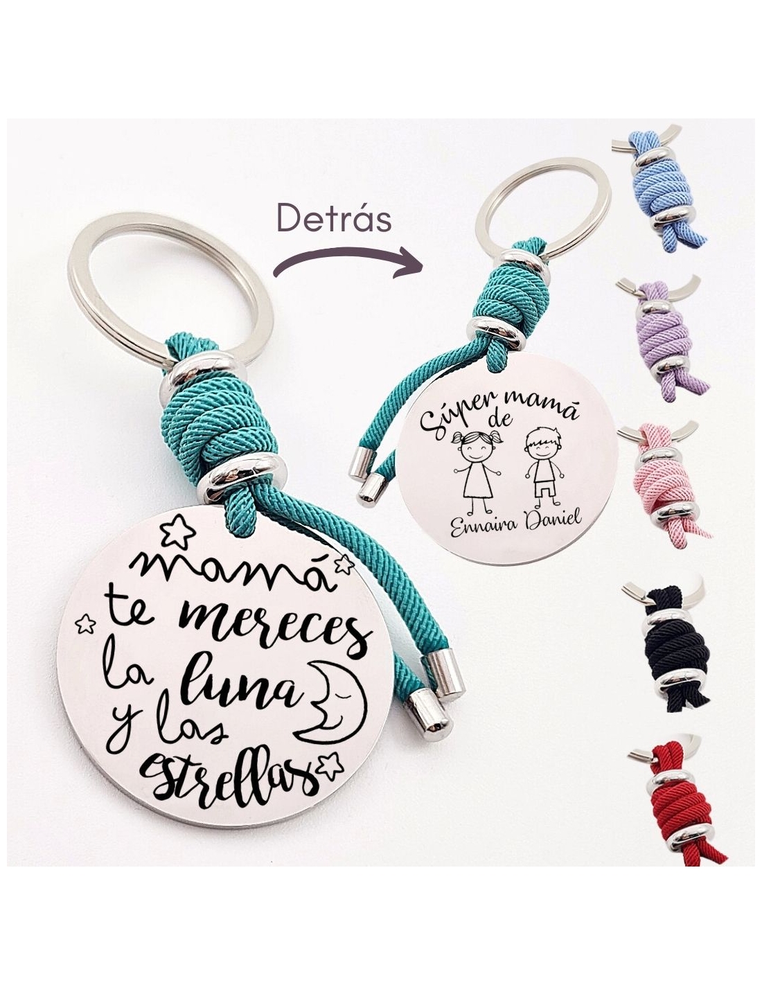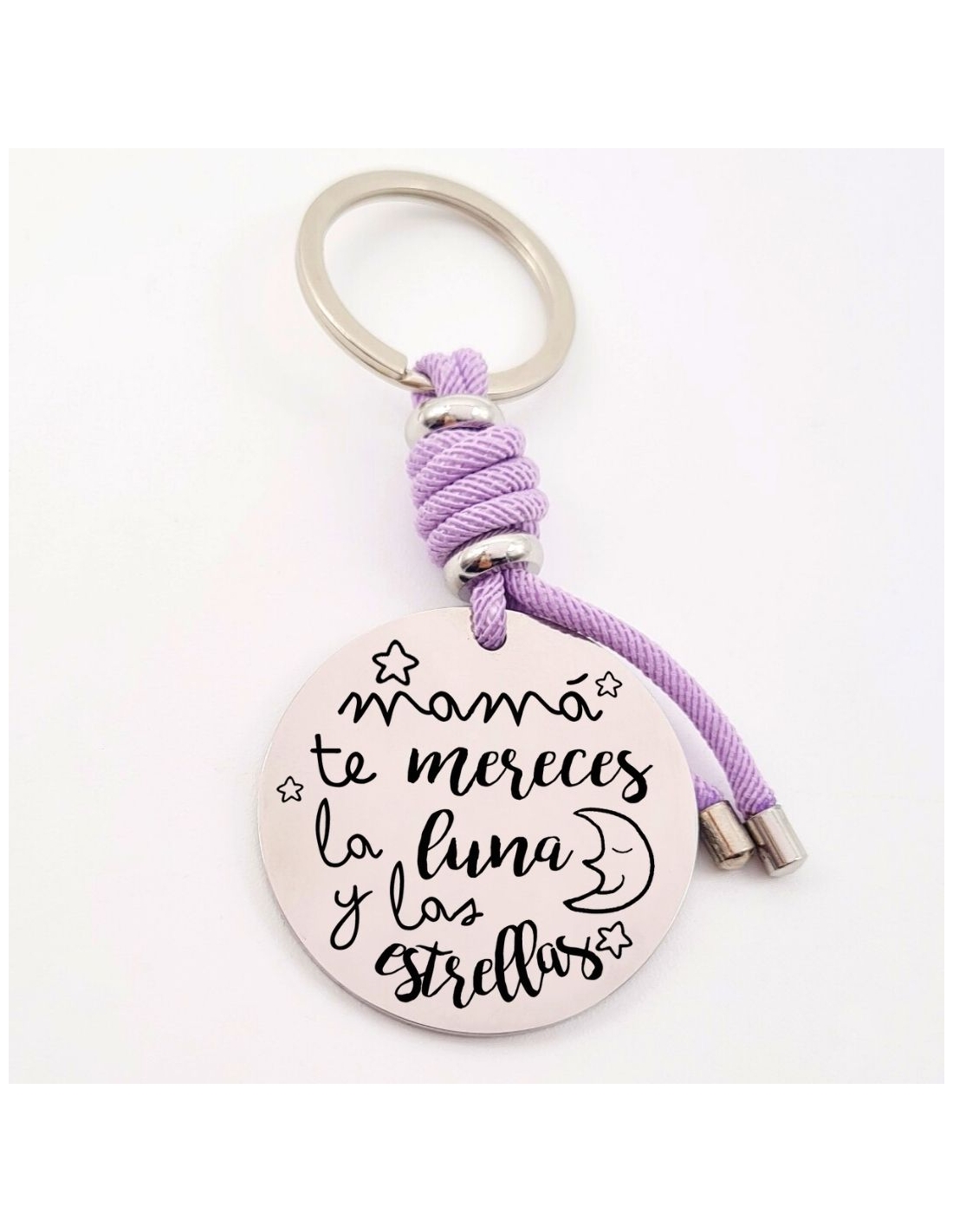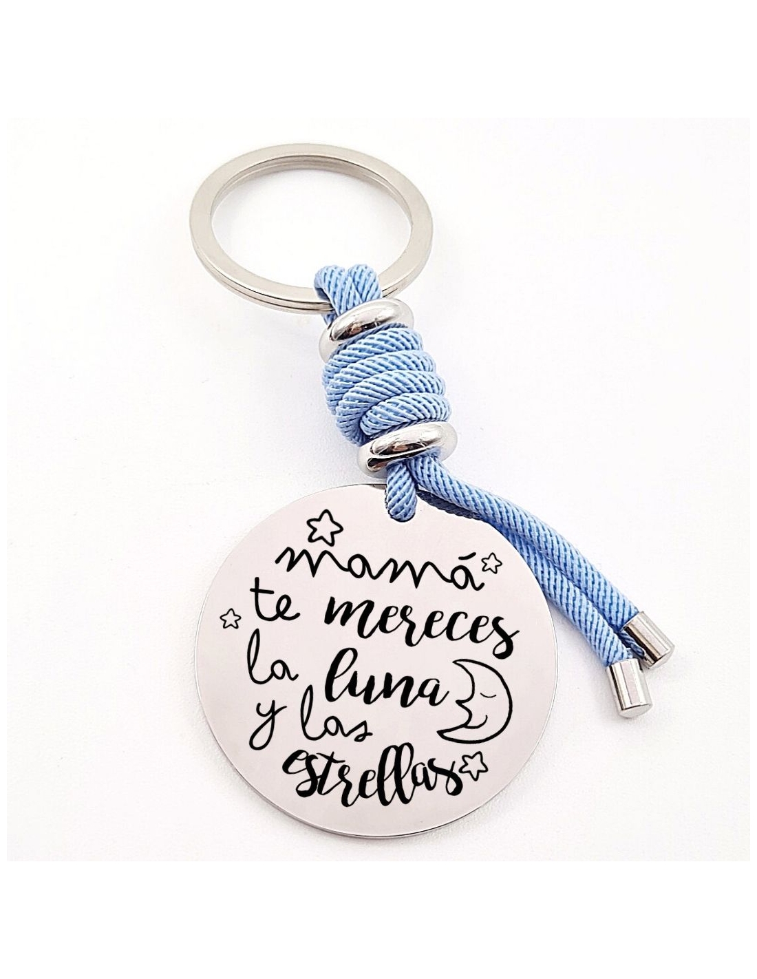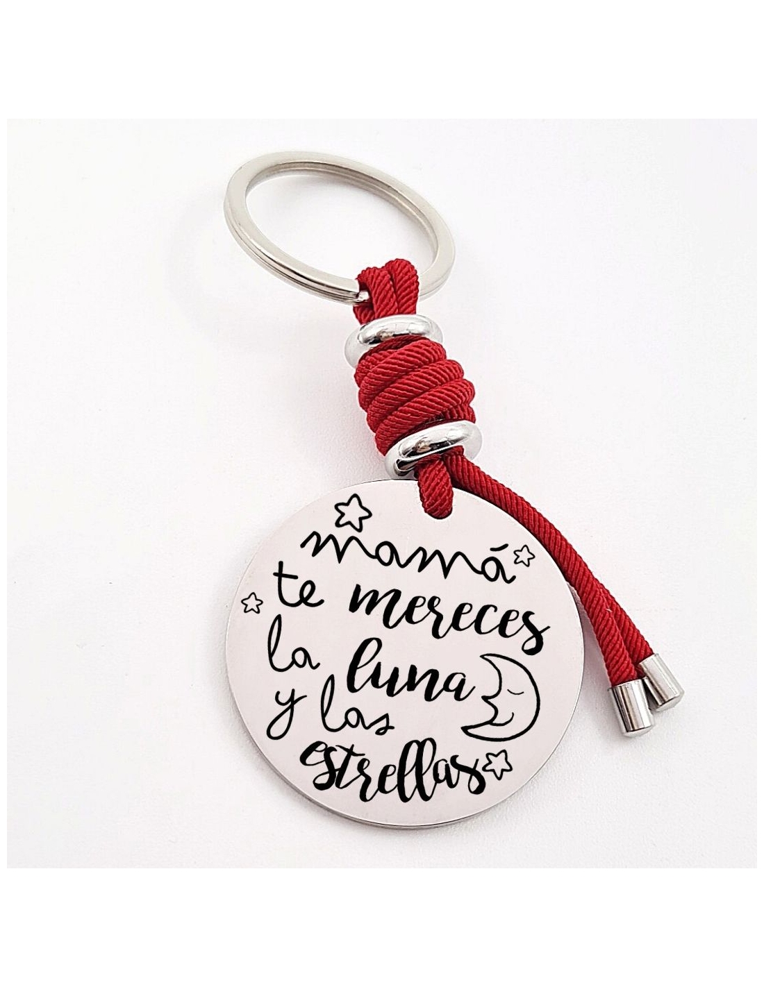 Llavero con frase, (Mamá te mereces la luna y las) con los nombres de los nietos, modelo VENTURA-2 de acero inoxidable.