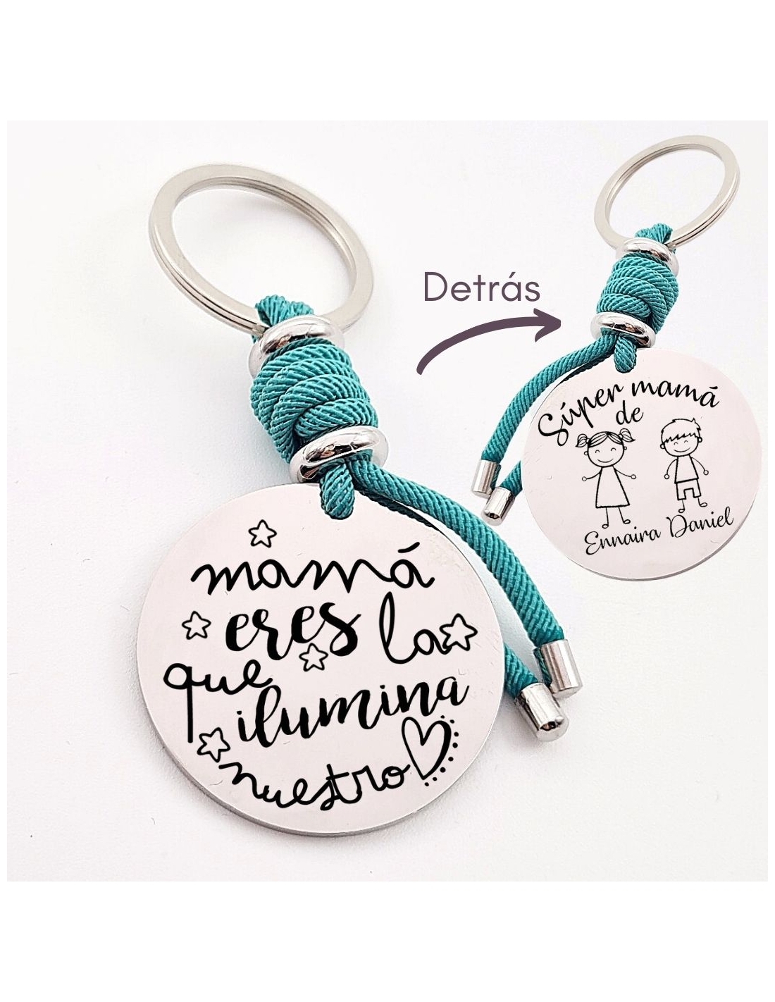 Llavero con frase, (Mamá eres la que ilumina nuestro) con los nombres de los nietos, modelo VENTURA-2 de acero inoxidable.