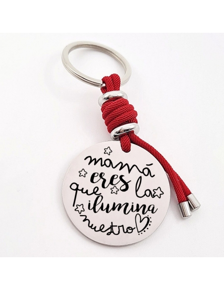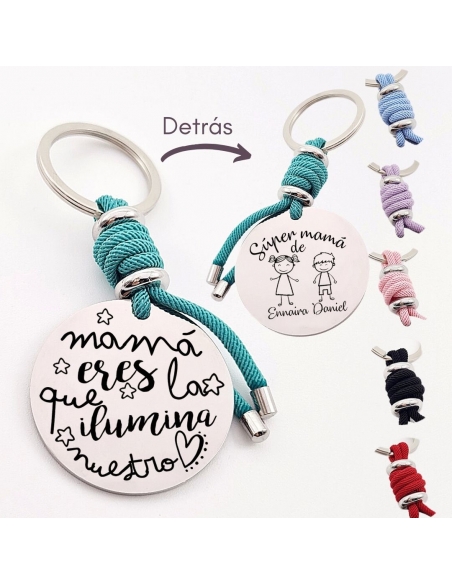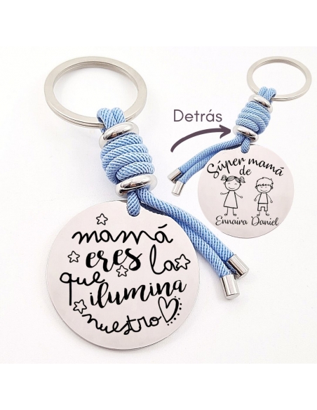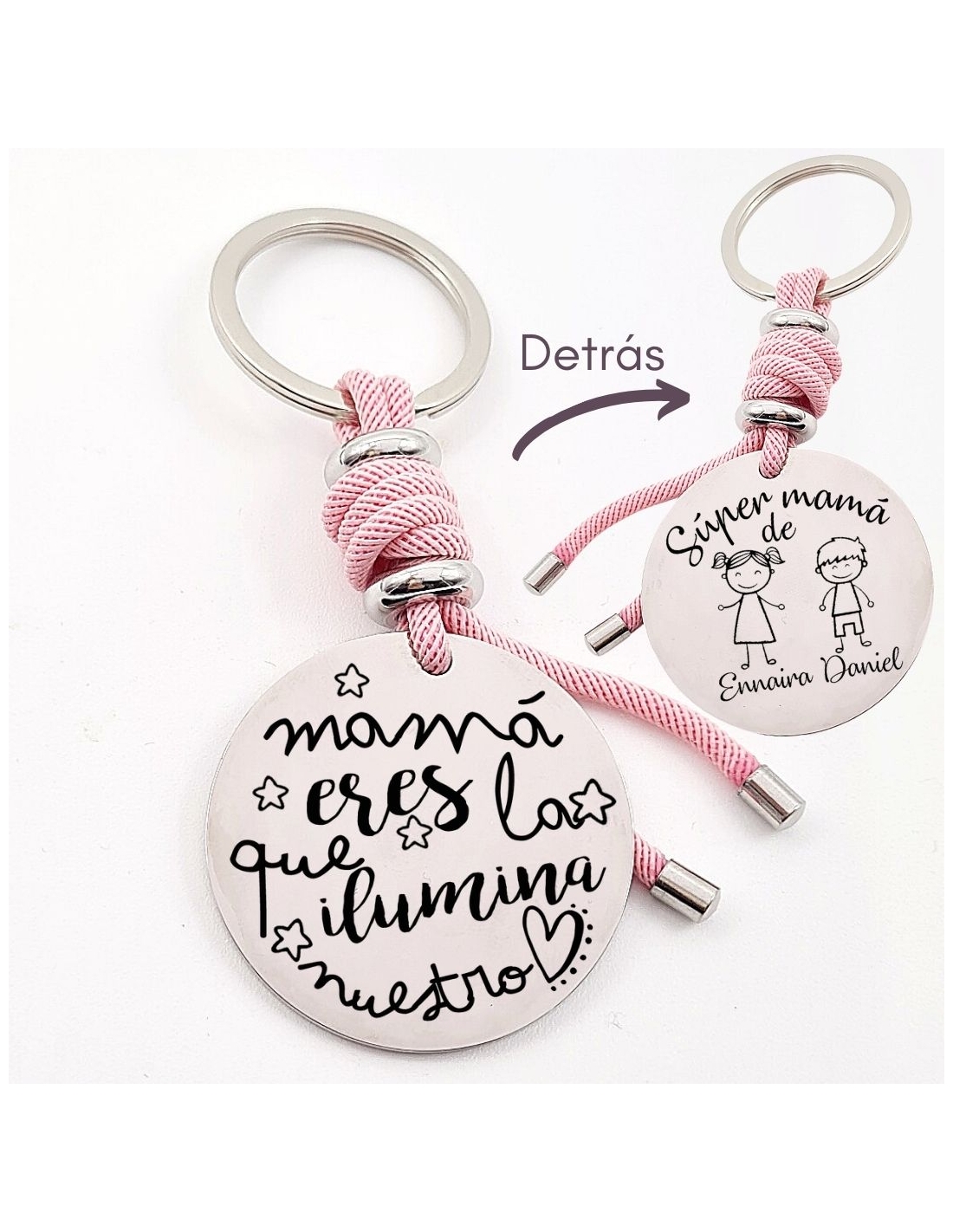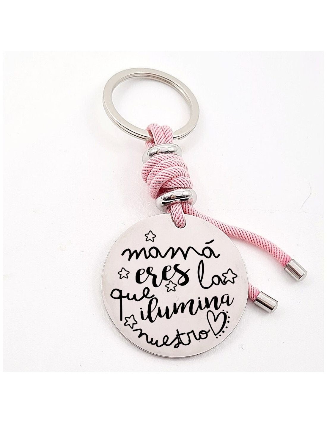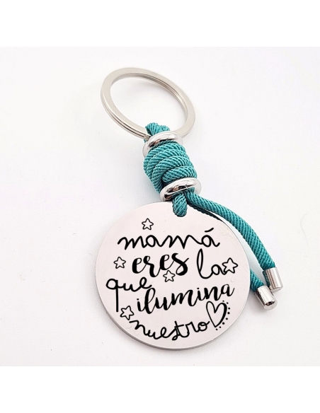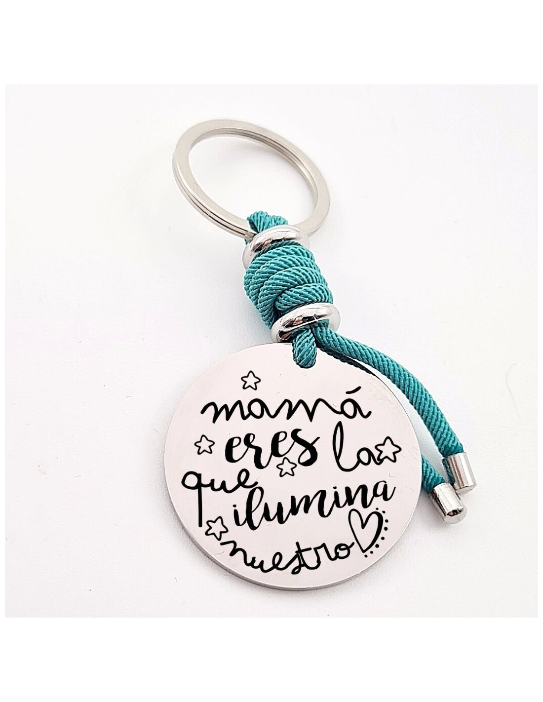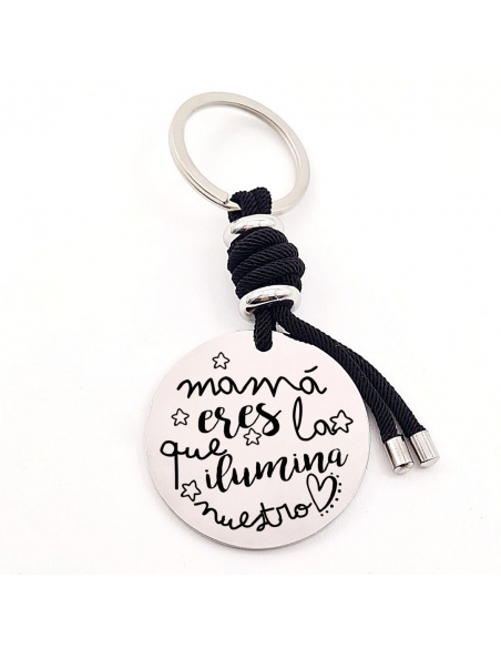 Llavero con frase, (Mamá eres la que ilumina nuestro) con los nombres de los nietos, modelo VENTURA-2 de acero inoxidable.