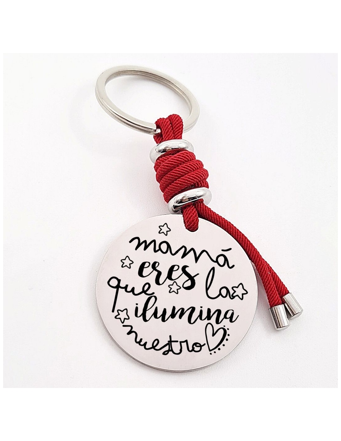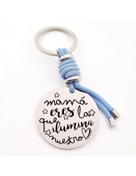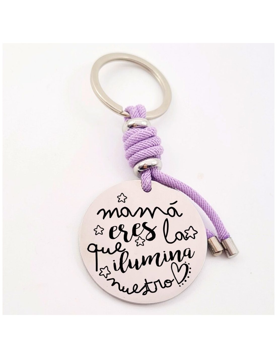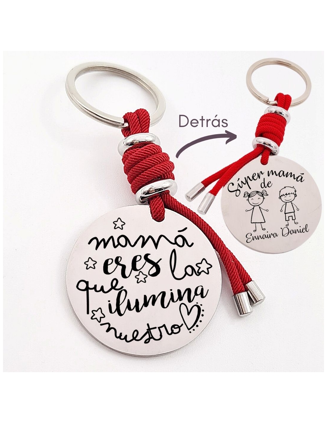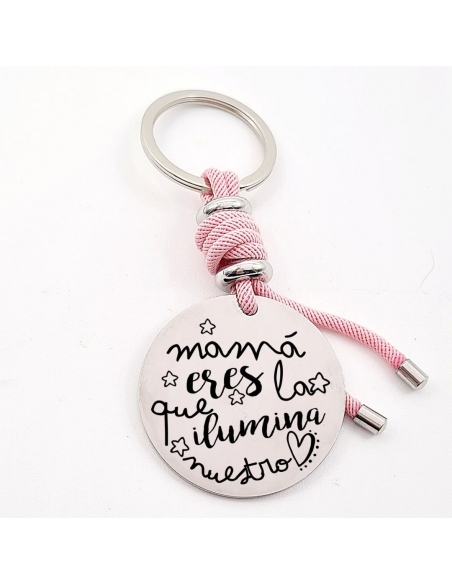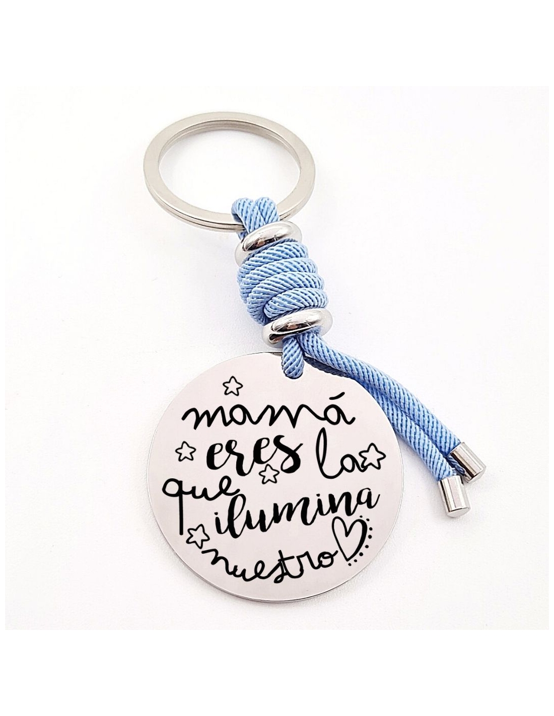 Llavero con frase, (Mamá eres la que ilumina nuestro) con los nombres de los nietos, modelo VENTURA-2 de acero inoxidable.