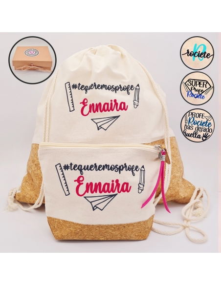 KIT 03 Caja regalo con mochila, estuche en corcho natural y algodón, de regalo diploma y pin de regalo..