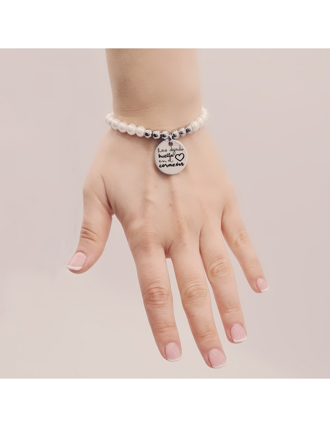 Pulsera modelo NACALA, has dejado huella en el corazón, montada con perlas de vidrio nacaradas, elástica.