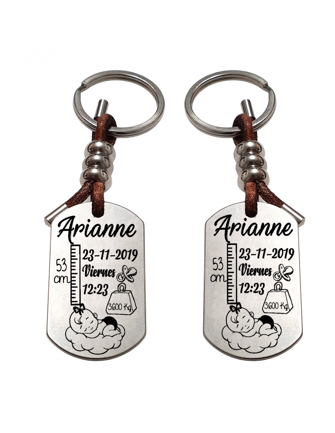 Llavero natalicio doble cara, niña y niña, modelo ADVENTURE, rellena los campos con los datos.
