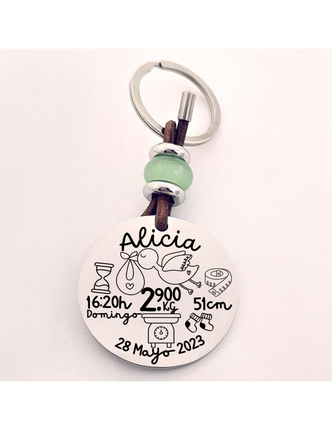 Llavero natalicio redondo, con los datos del bebé, disponible en dos modelos en 4 colores.