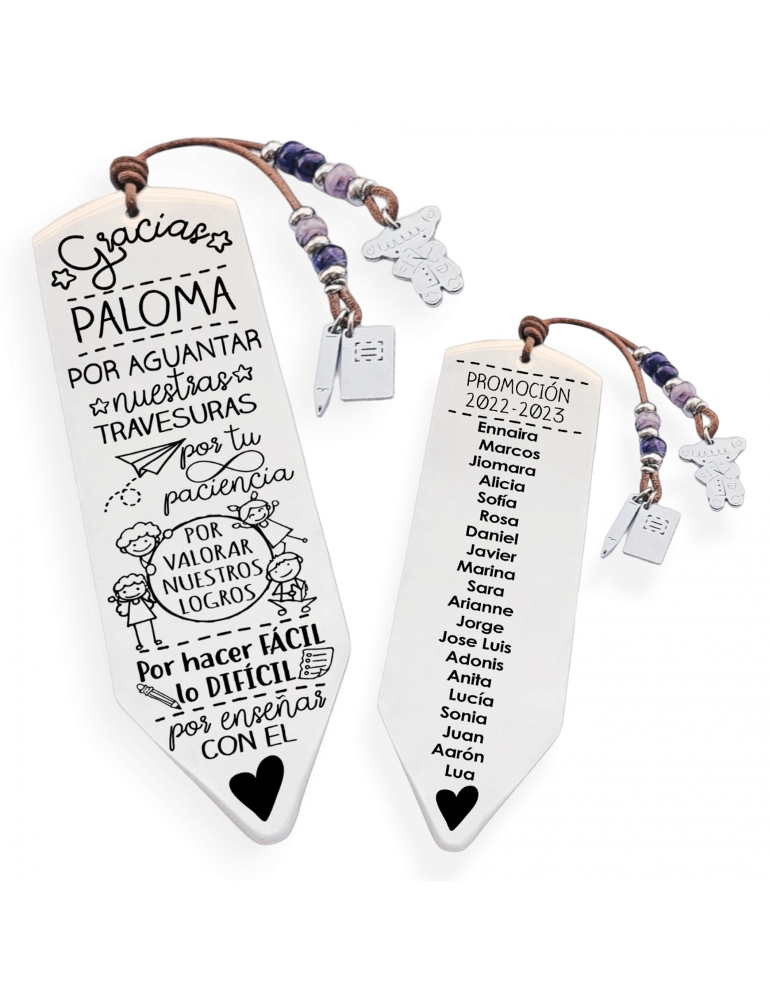 Personaliza el marcapáginas por delante con el nombre del profesor. Puedes añadir todos los nombres de los niños por detrás, junto la promoción, como en el ejemplo.