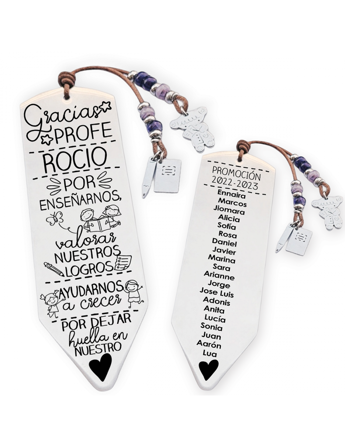 Personaliza el marcapáginas por delante con el nombre del profesor. Puedes añadir todos los nombres de los niños por detrás, junto la promoción, como en el ejemplo.