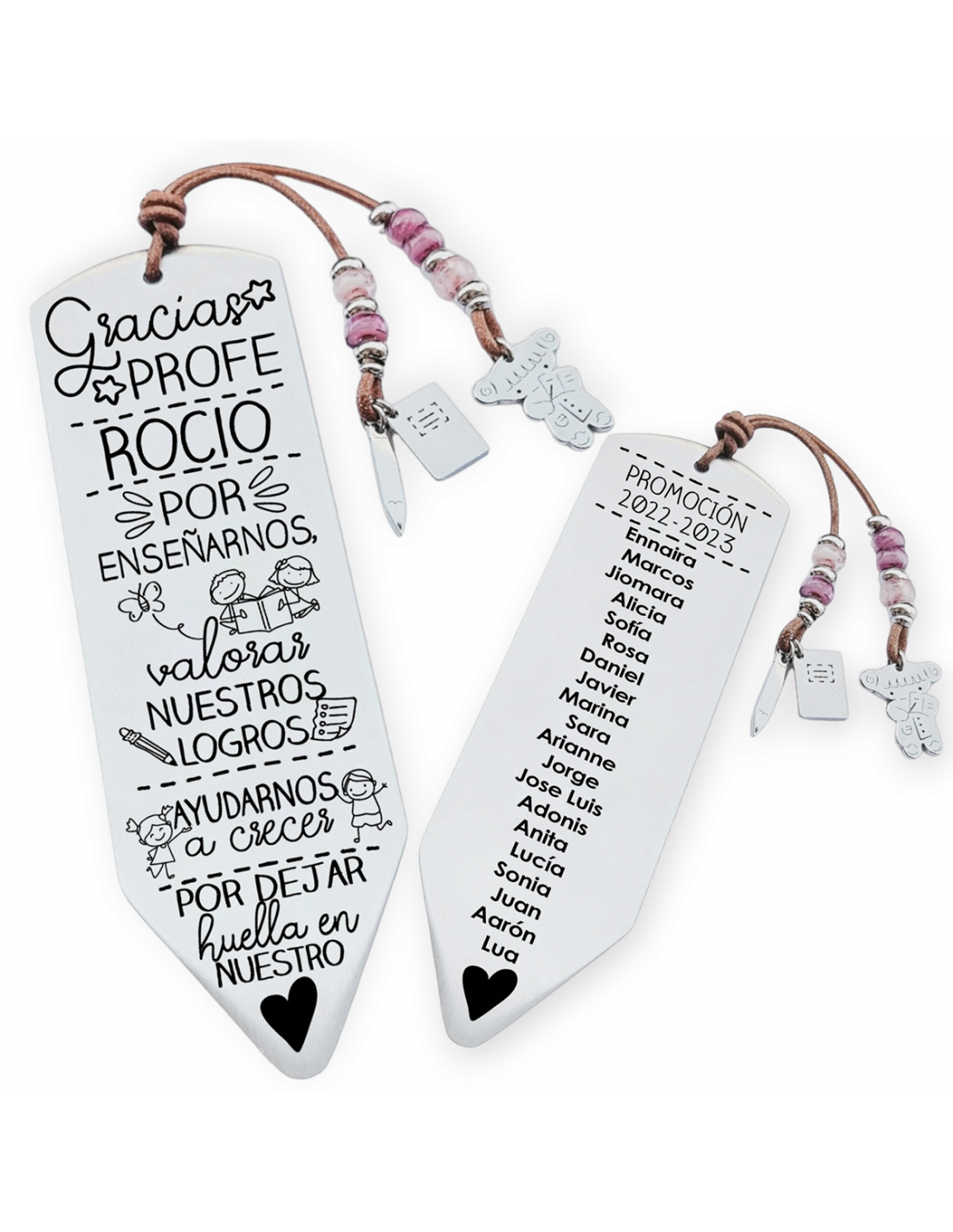 Personaliza el marcapáginas por delante con el nombre del profesor. Puedes añadir todos los nombres de los niños por detrás, junto la promoción, como en el ejemplo.